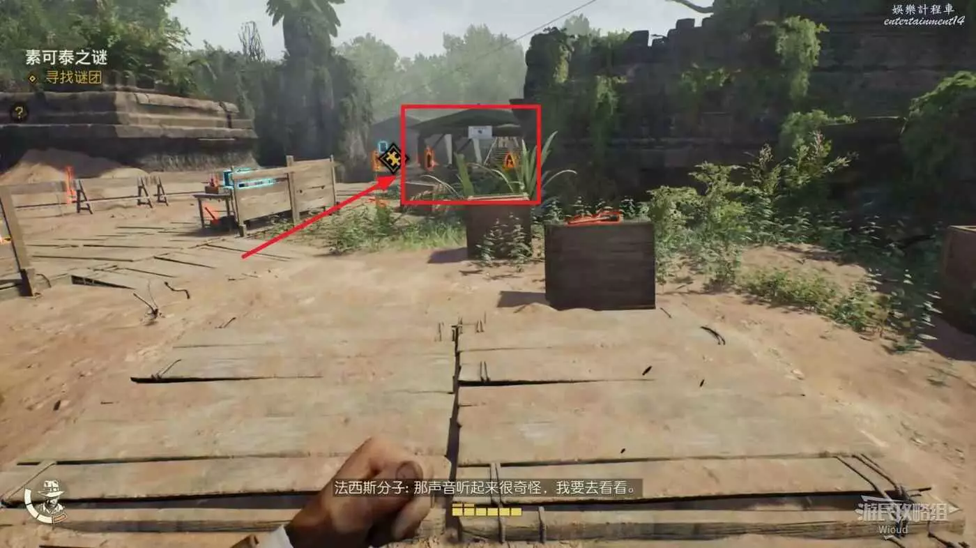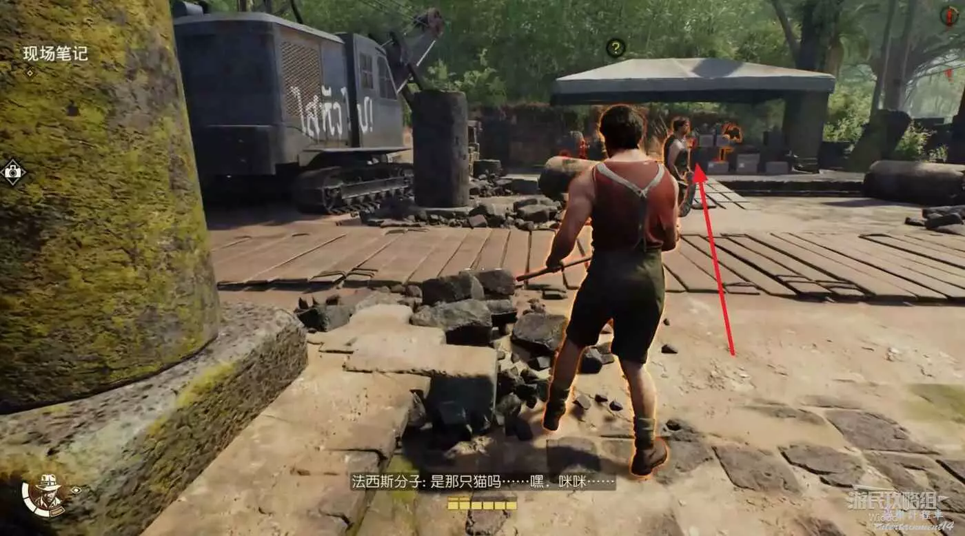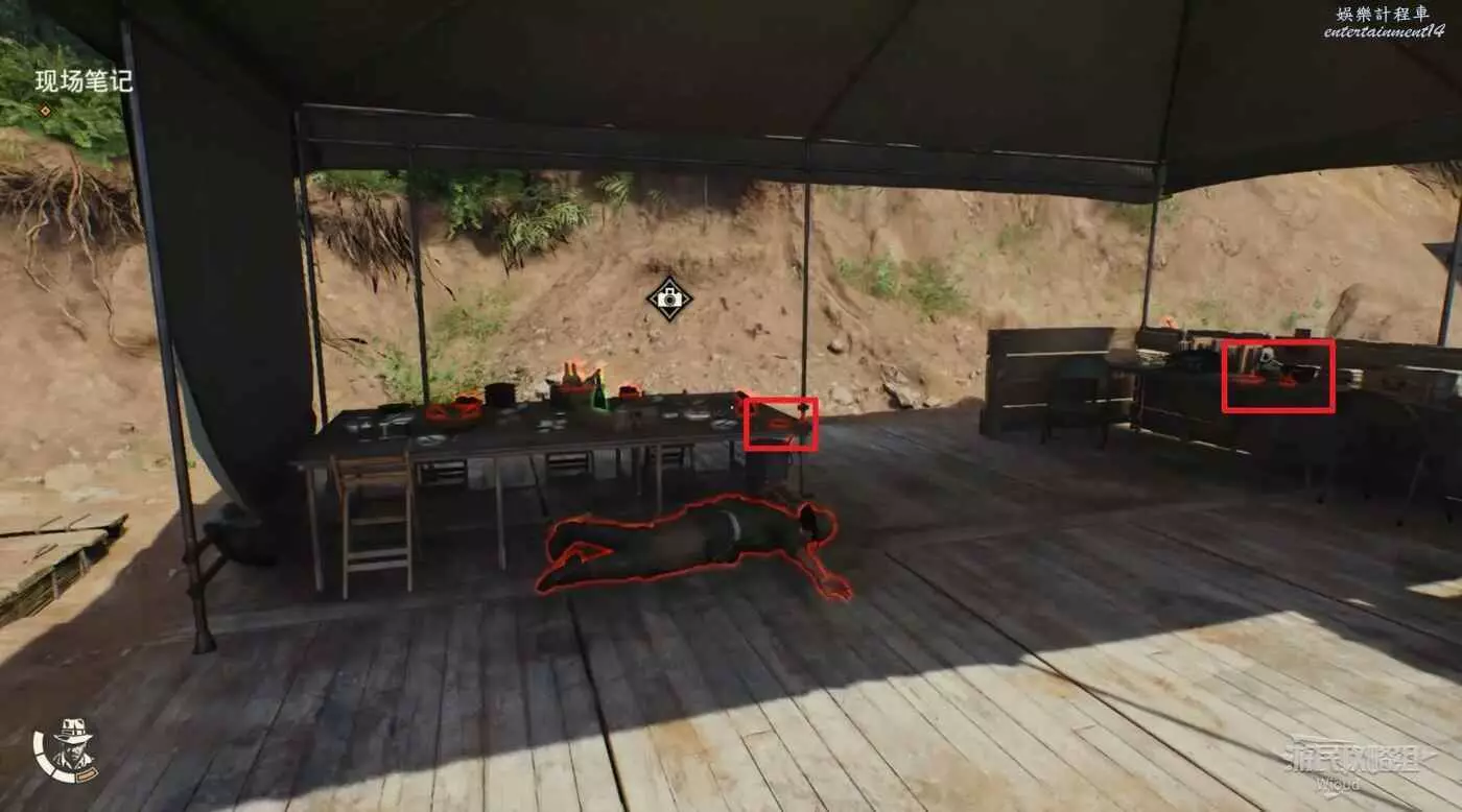 這個帳篷外面有一個警示牌,對其拍照可以接取謎團【猴子搗亂】。