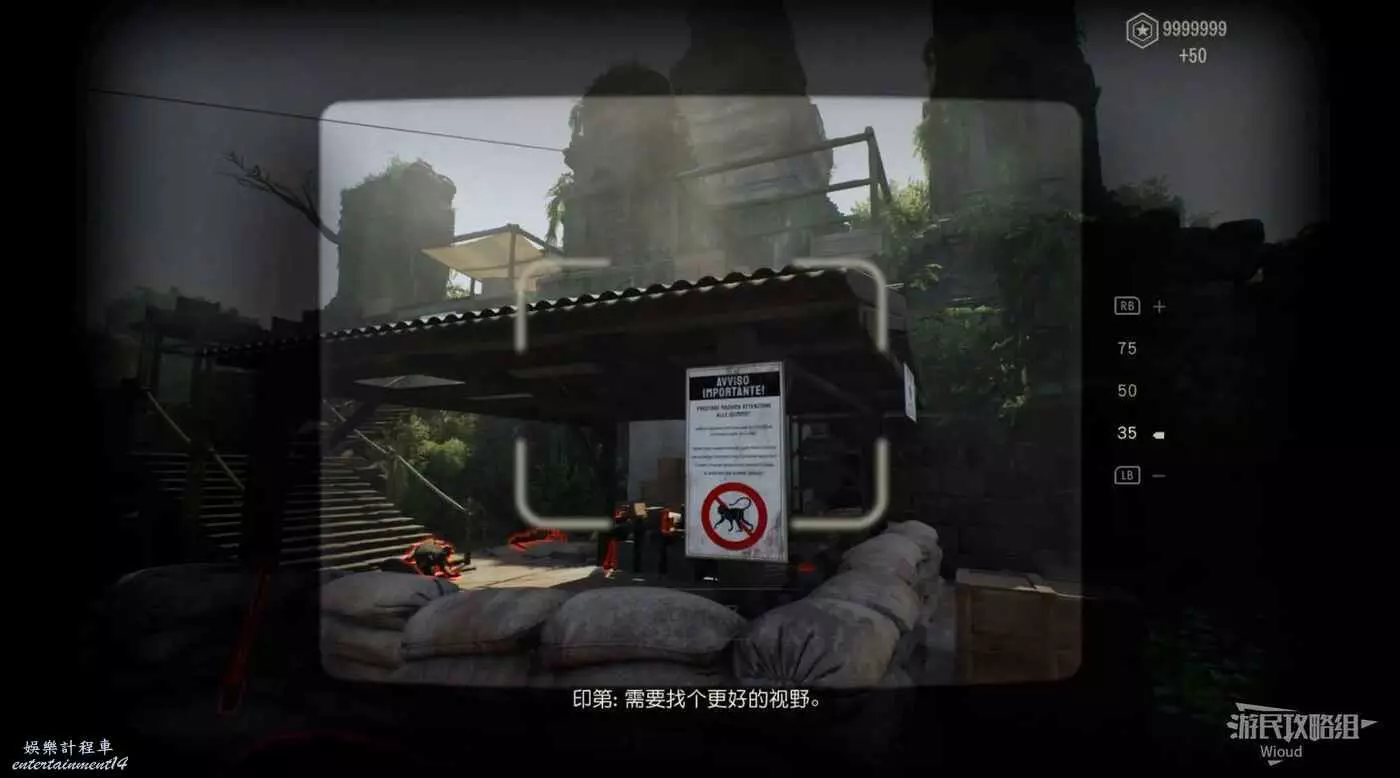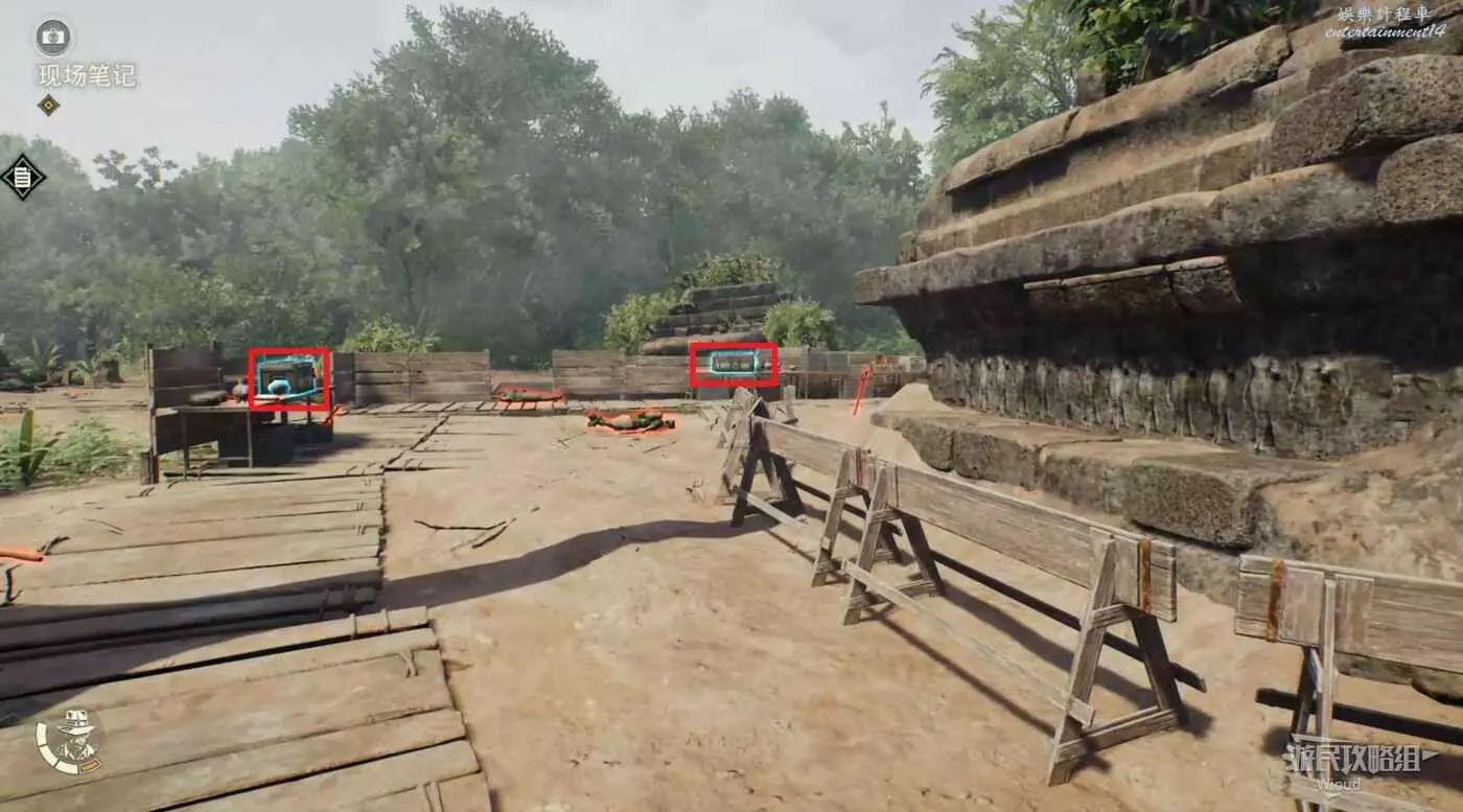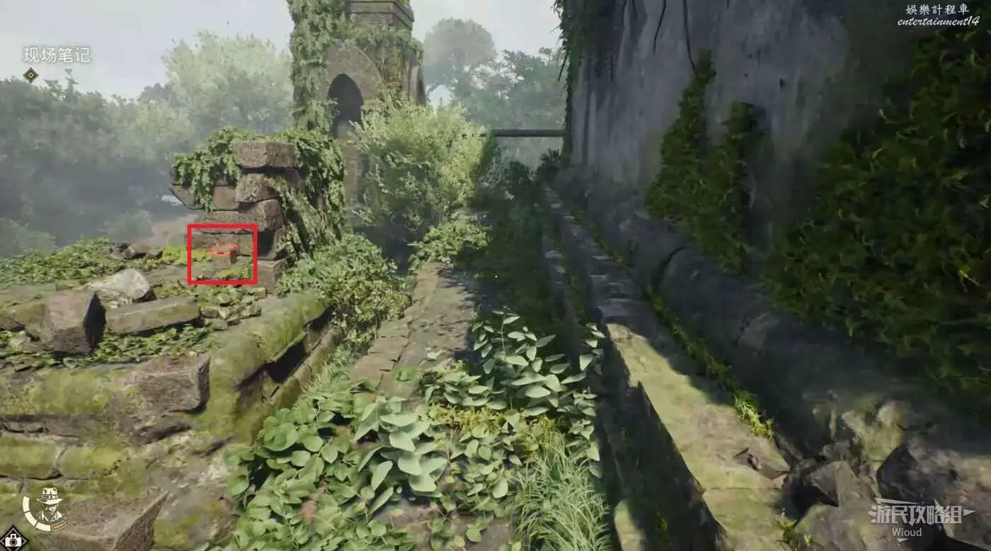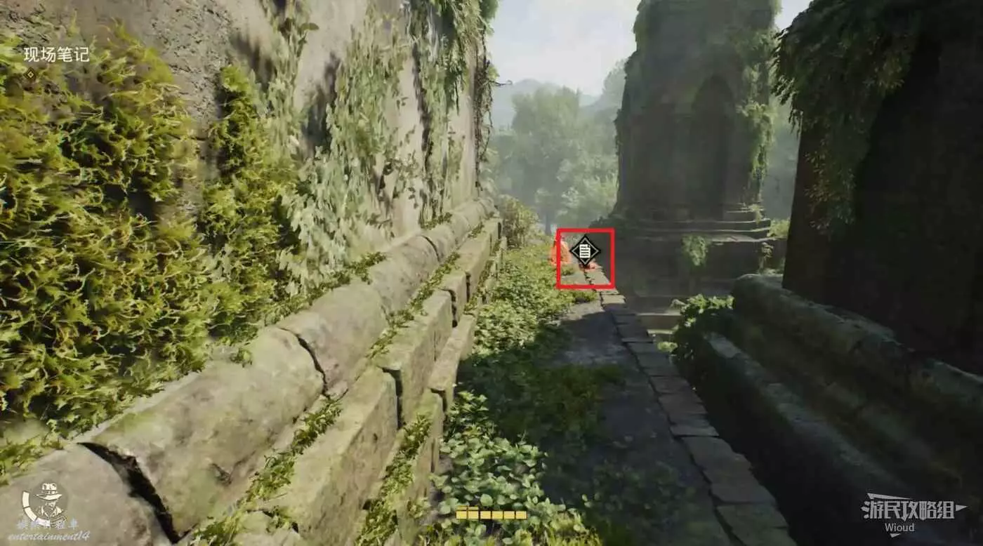 繼續沿著樓梯爬到後面,跳到下圖所示的高台並繞到對面拿到筆記【紀念碑研究】。
