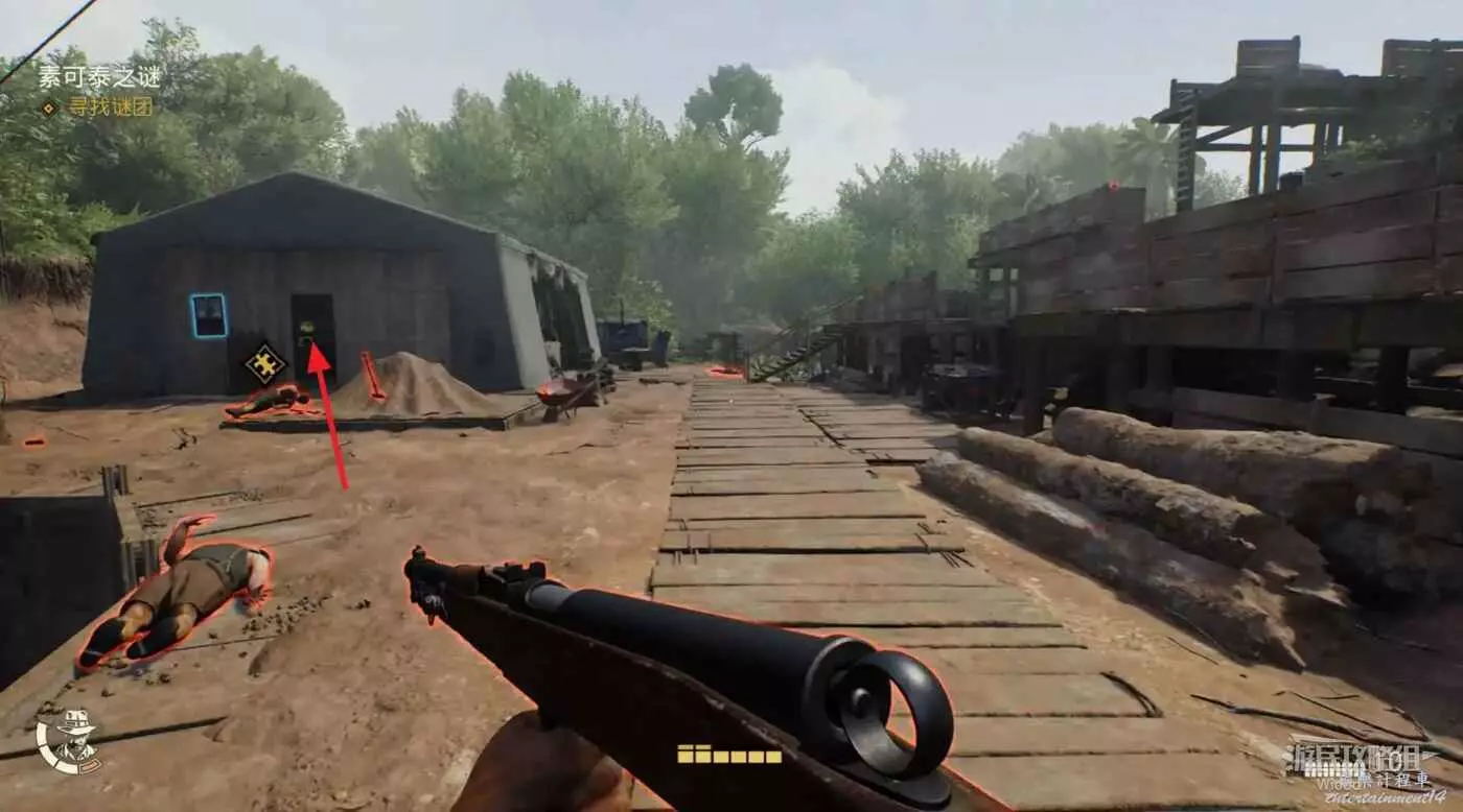 目前中間的區域我們還沒探索過,從右上角來到中間區域進入營地。