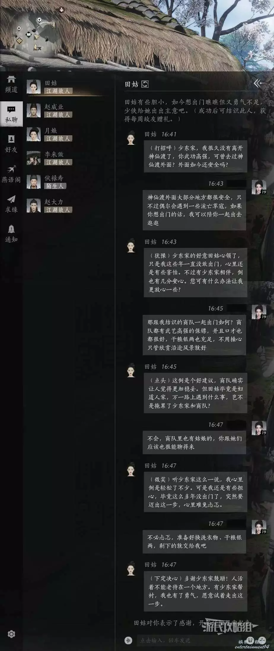 田姑想離開神仙渡去外面遊玩但又不敢出門,大致的聊天方向就是鼓勵她出門看看,可以陪她一起出去,出門在外保證好人身安全即可。具體恢復內容可以參考下圖(僅提供思路,恢復內容不唯一,沒有標準答案)。