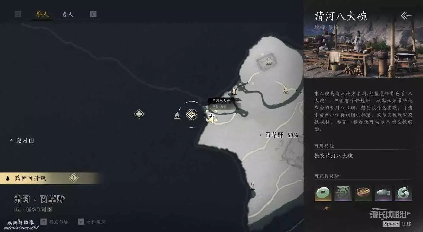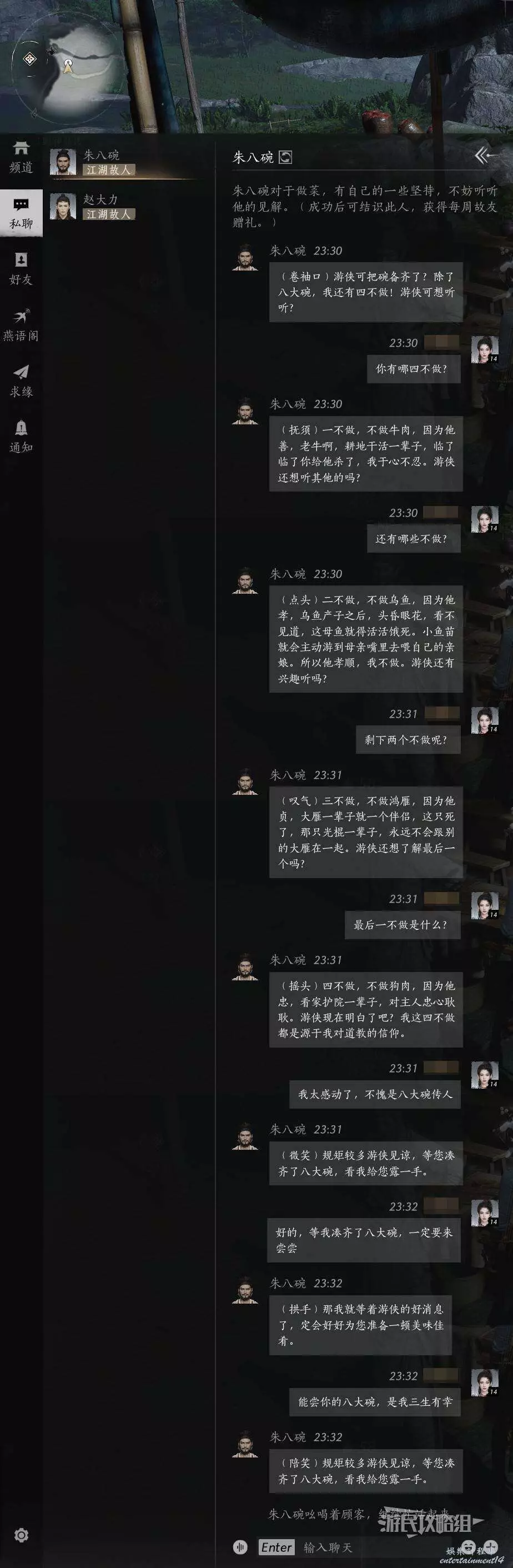 燕雲十六聲 朱八碗好感度聊天攻略 28 12 月 2024-12-28 廣告 作者:瑞破受氣包 來源:遊民星空 朱八碗地圖位置 朱八碗結交攻略 朱八碗的基本思路就是問他有哪四不做,全部說完之後開始猛誇他的八大碗就行,在結束對話前可能會觸發重複的恢復,不用擔心這種重複恢復,多誇幾次八大碗直到出現結束的提示即可。具體恢復內容可以參考下圖(僅提供思路,恢復內容不唯一,沒有標準答案)。
