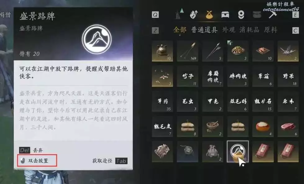 燕雲十六聲 路牌製作與放置教學 28 12 月 2024-12-28 廣告 作者:秋梨花被遊戲玩 來源:bilibili 路牌製作 打開背包,有一個建造的欄目,然後點擊下方的製造。 然後選擇手工,這樣就能看到路牌的製作了。 消耗飽食:1 需要材料:粗礦石*1、原木*2 製作好後會出現在背包的道具欄目裡。 放置路牌 按兩下路牌 然後在功能表中可以新增一些留言、圖片等內容 然後按回車鍵就會在人物位置放置路牌。