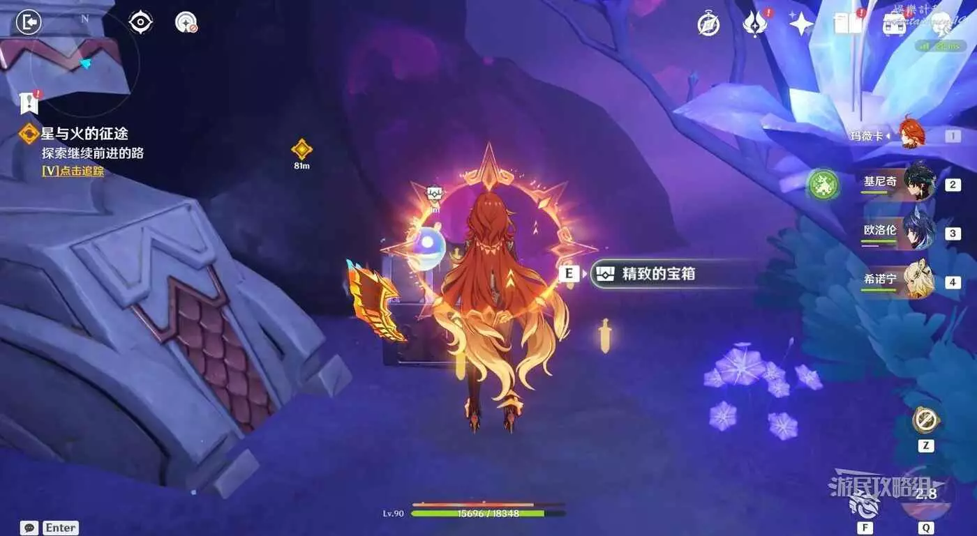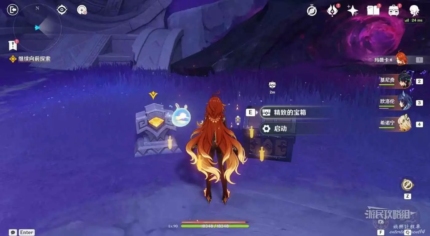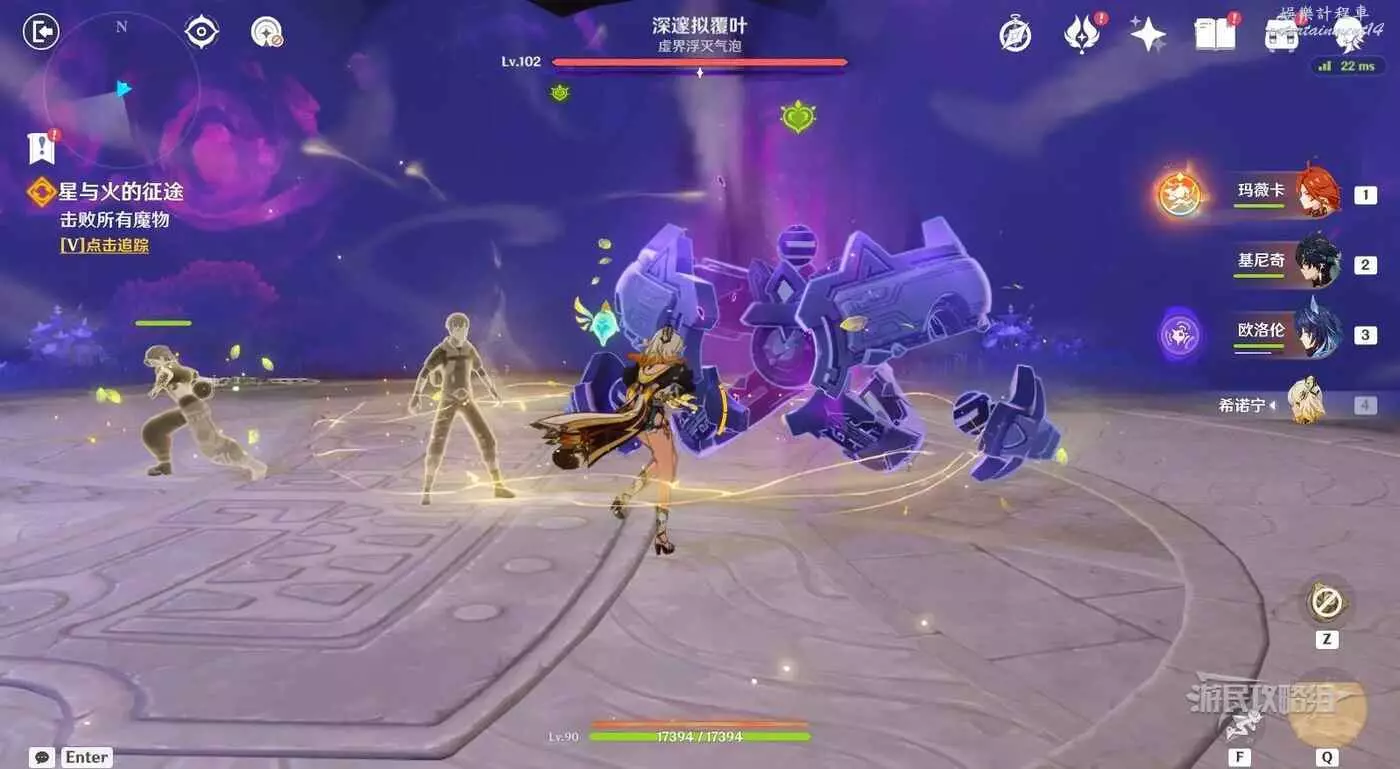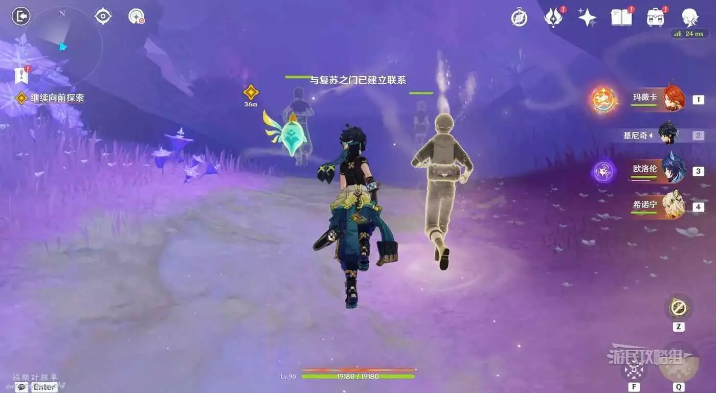 依然是旅行者視角,在拾取【寶箱1】後穿過大門,繼續沿路前進會觸發對話,觸發其他靈魂幫忙,站在金色罩子內穿過紫色霧氣,前方需要擊敗魔物。
