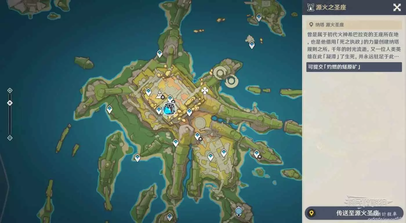 【源火之聖座】需要完成魔神任務第五章第五幕才能解鎖,位置如下圖所示。
