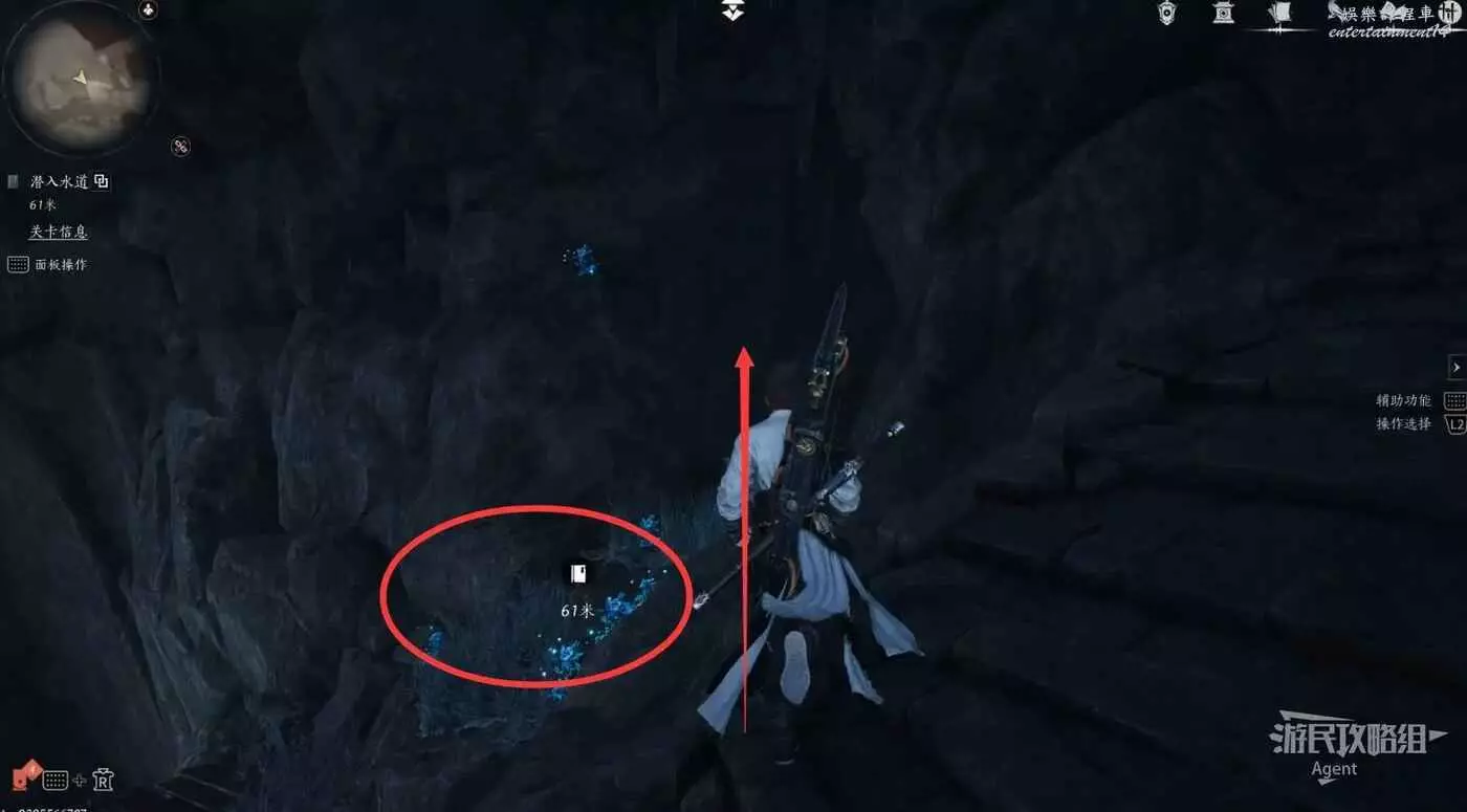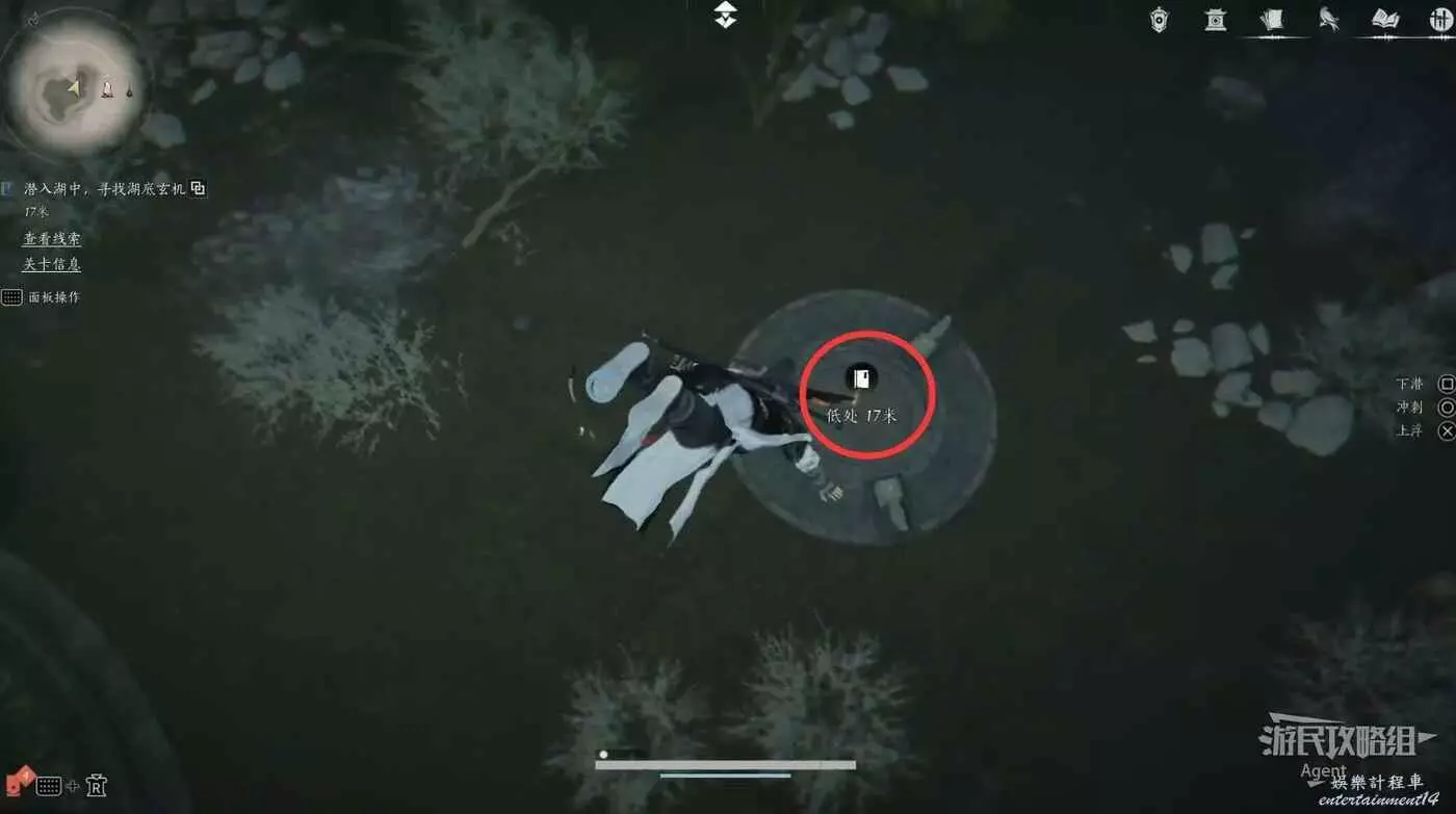 跳入湖底發現個井口,操作周圍三個機關即可打開井口放幹湖水。