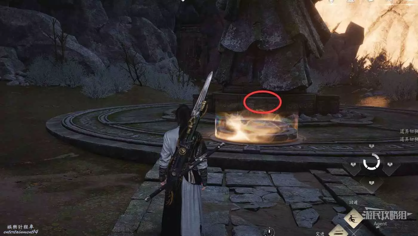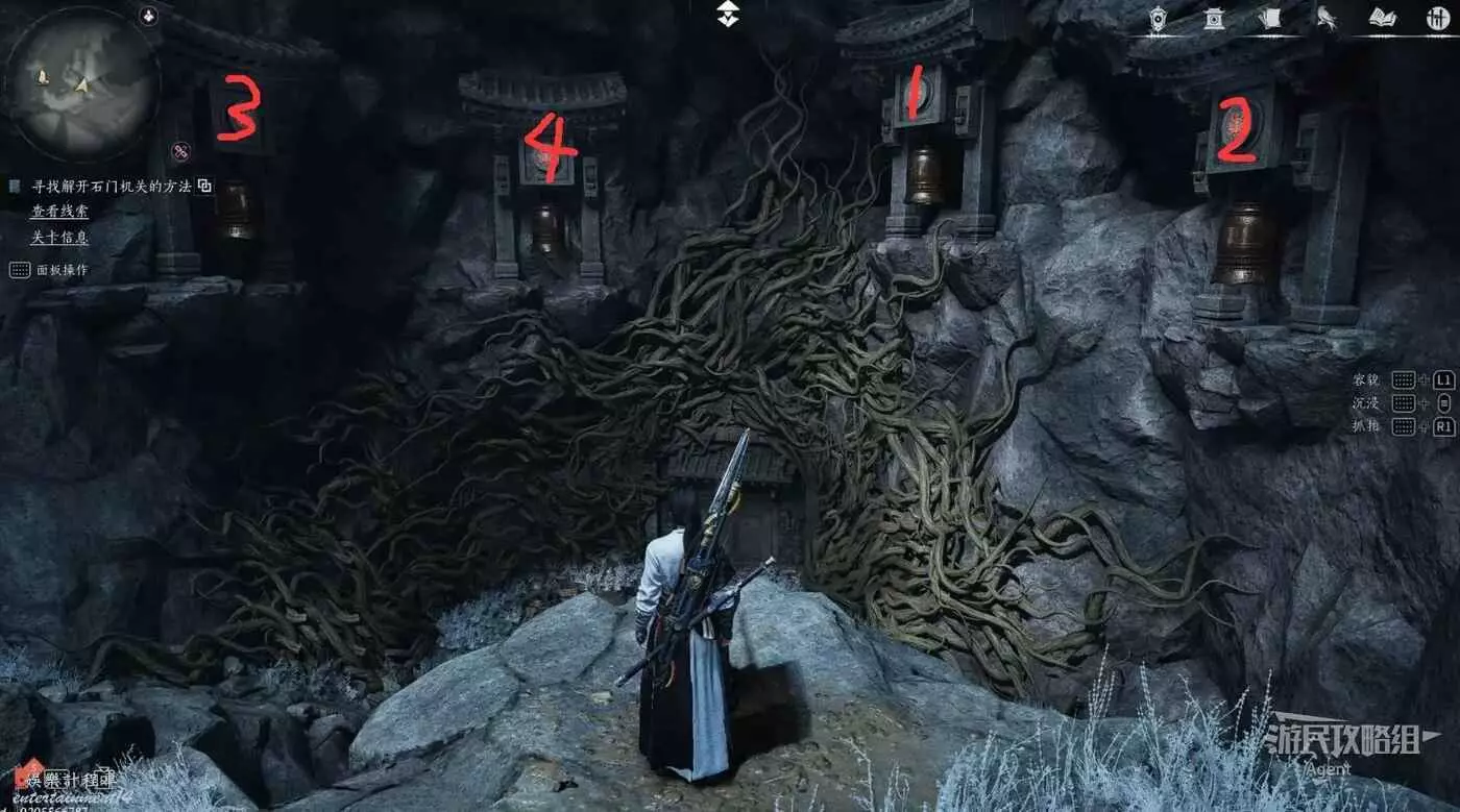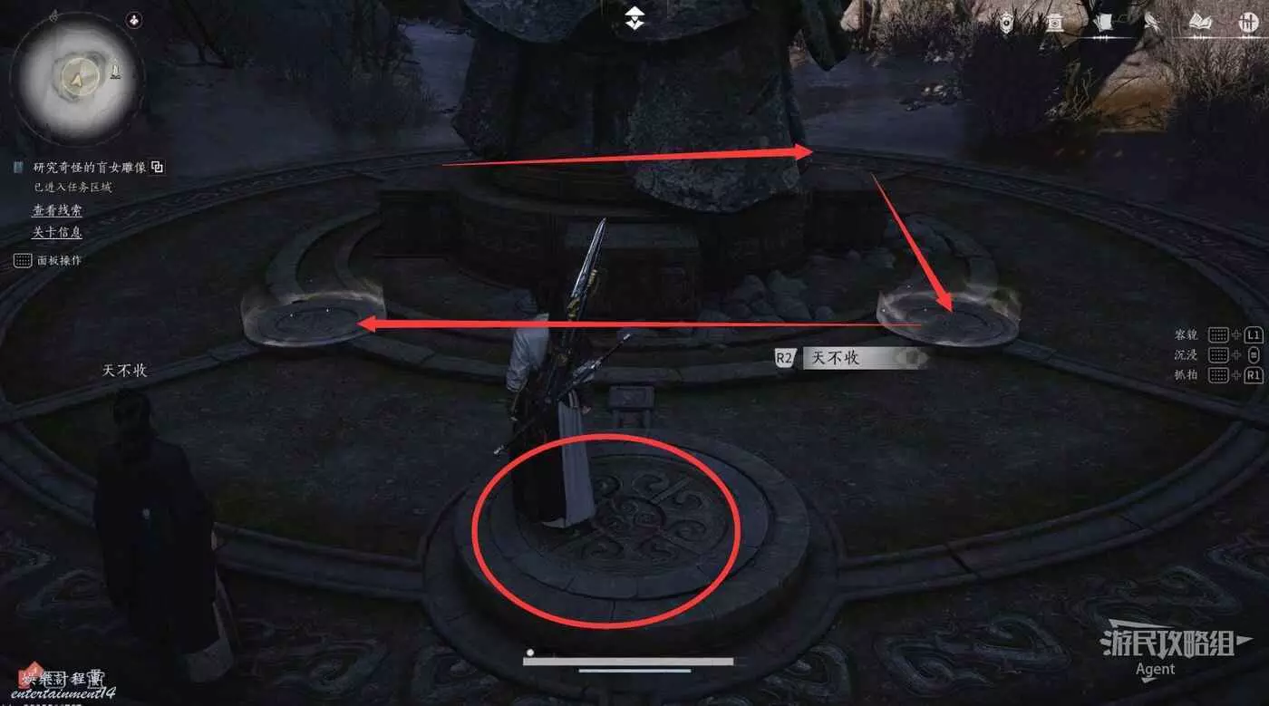 和天不收對話後,踩天不收旁邊的大按鈕啟動解謎,然後按照“北東南西”的順序,踩雕像周圍的四個小按鈕。