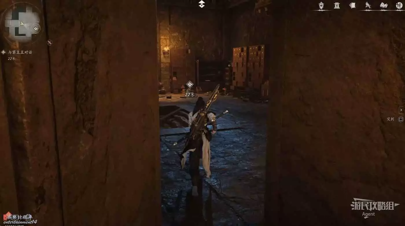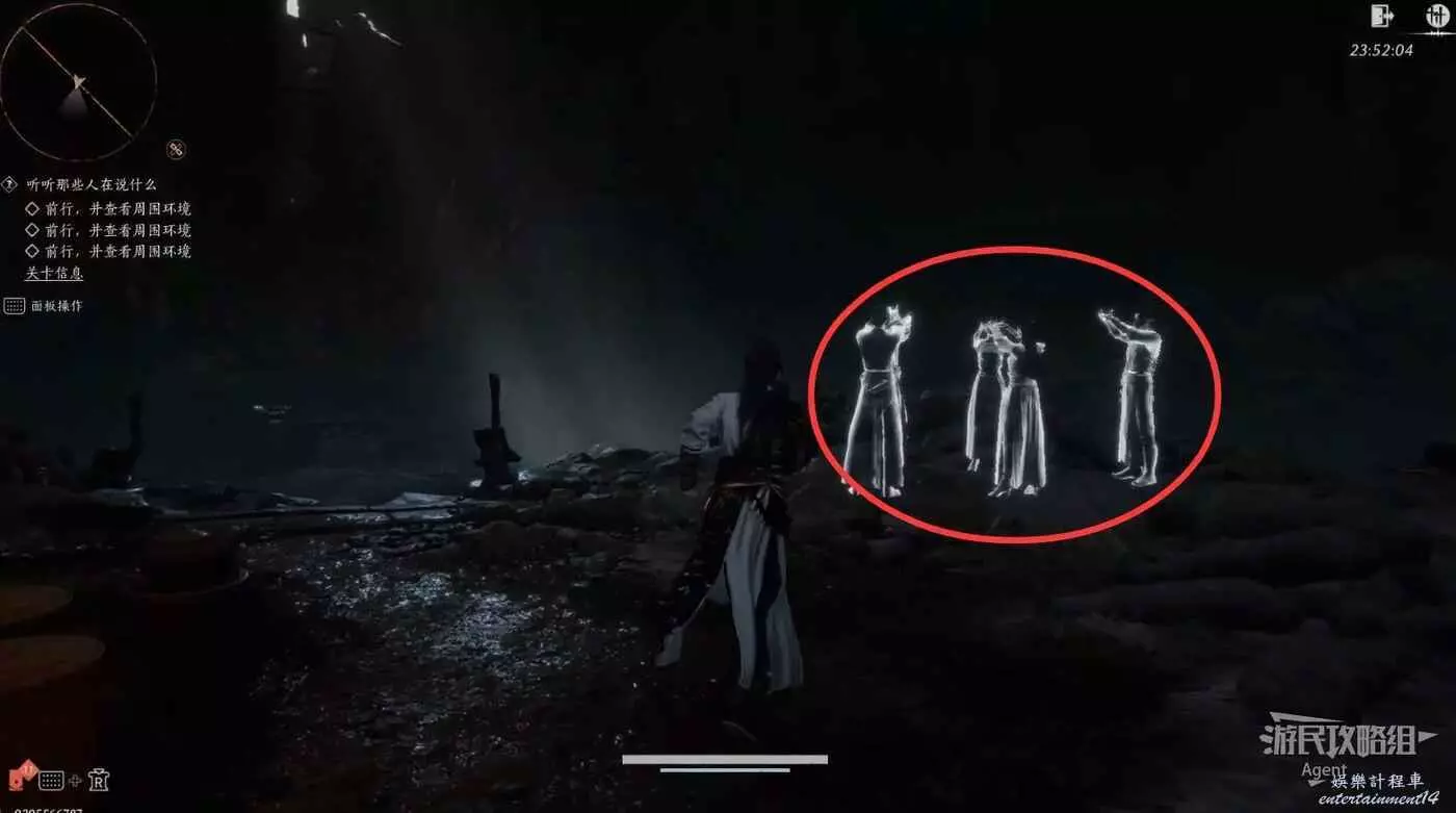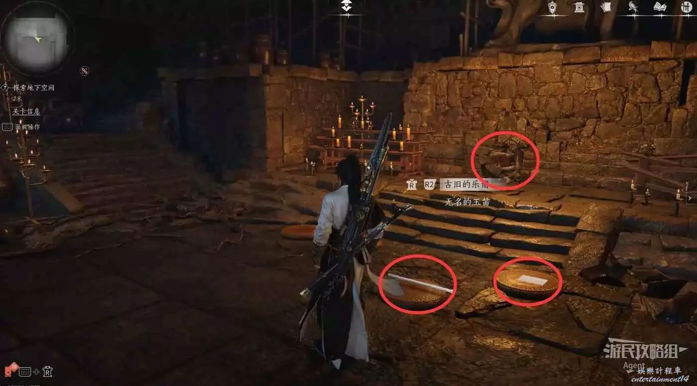 在大廳的雕像前見到無面人首領程心,先拿樂譜然後拿玉笛演奏。