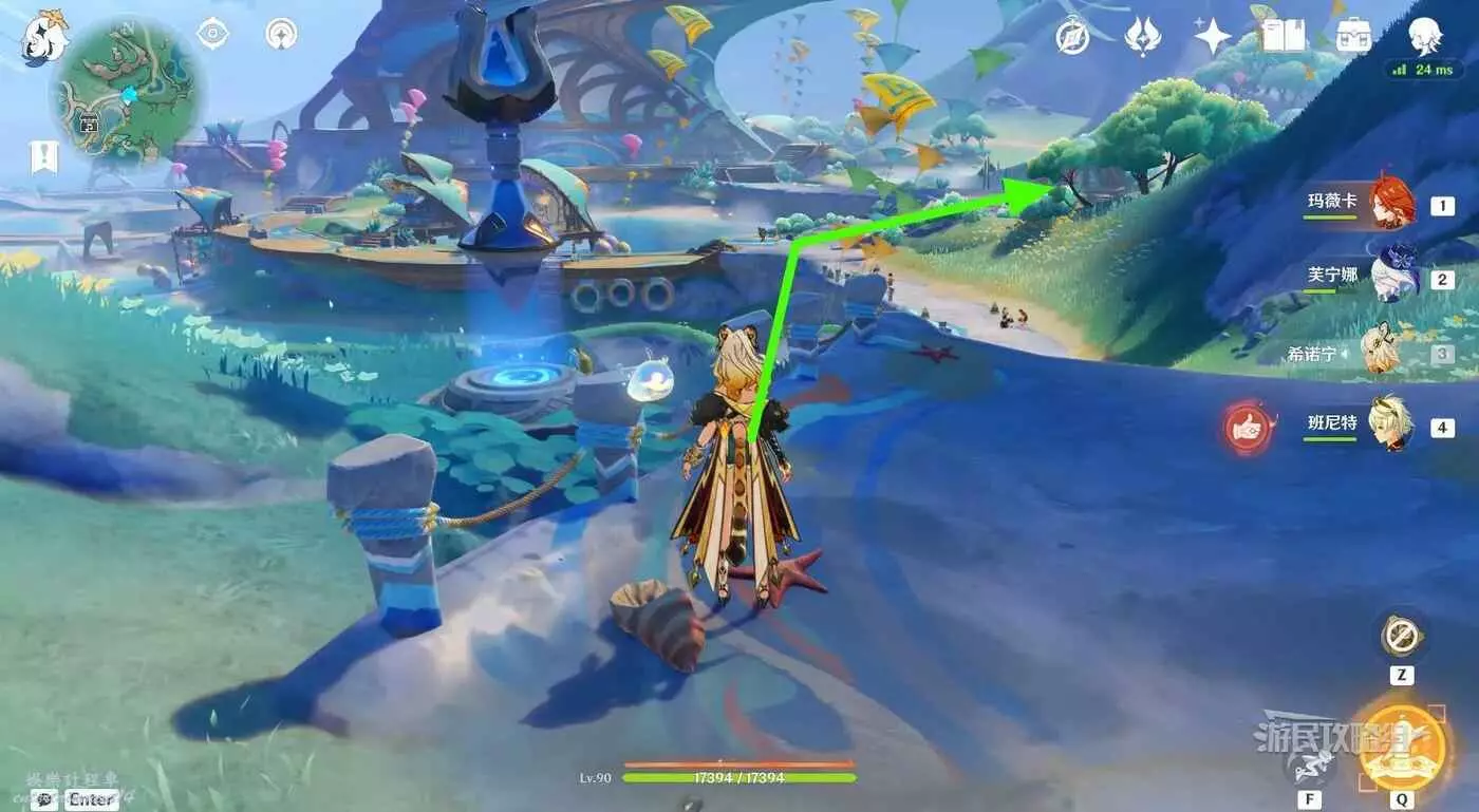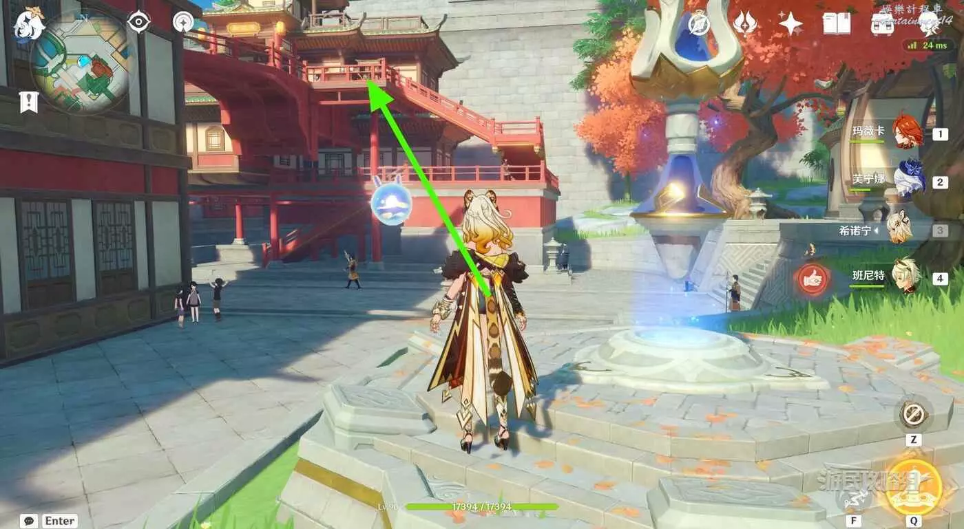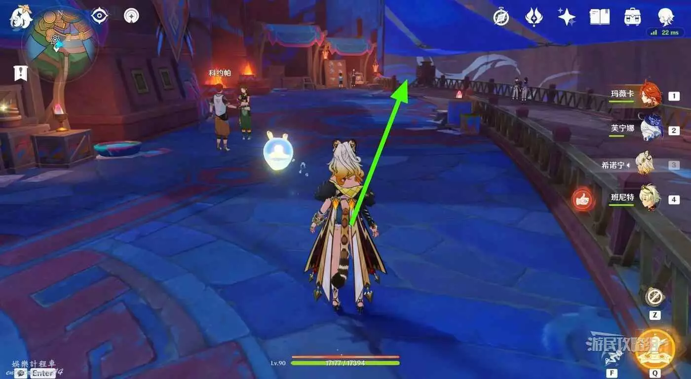 參考下圖綠色箭頭標記,從傳送錨點所在位置出發,沿路往小地圖西南邊走。在第一個岔路口右轉。