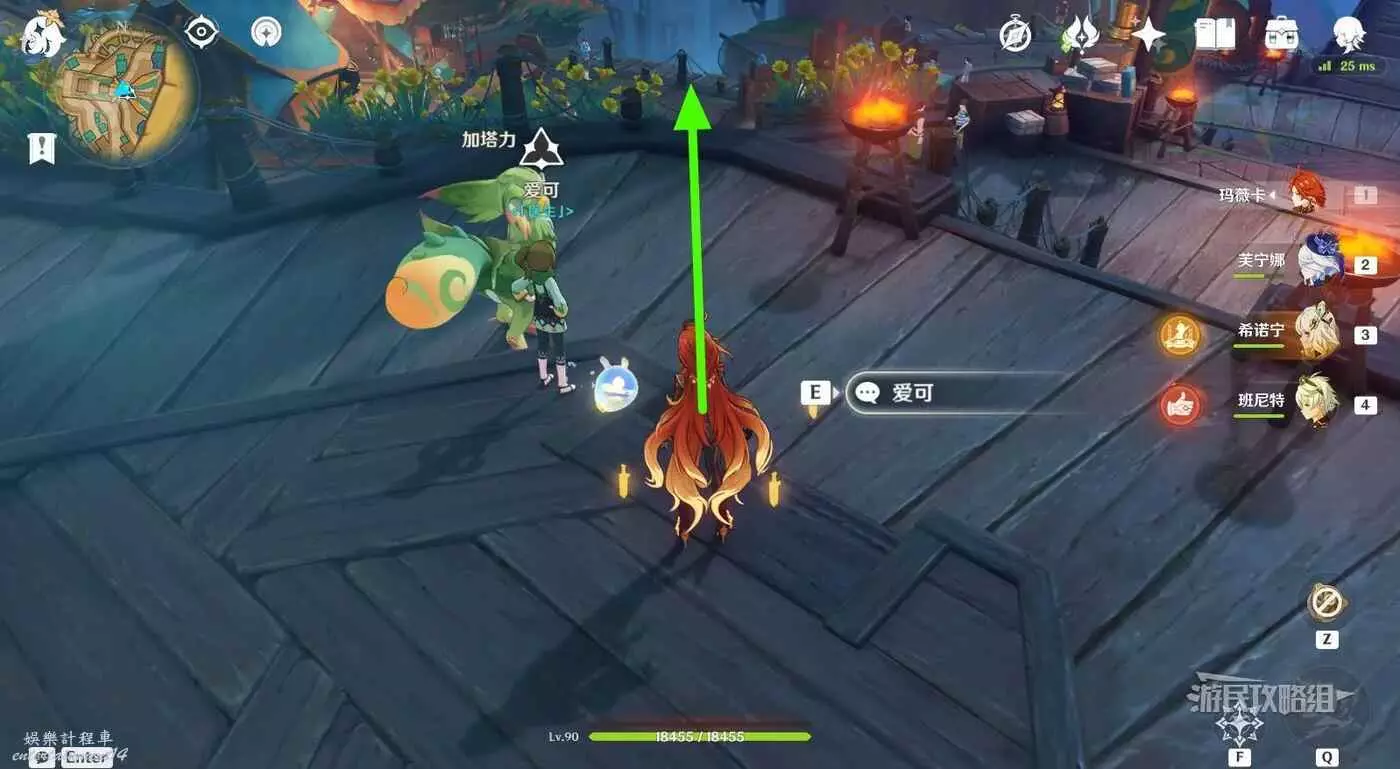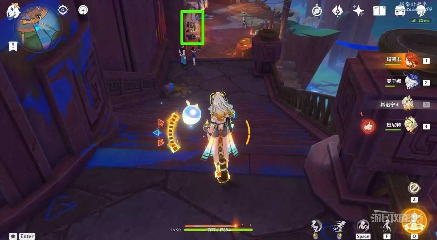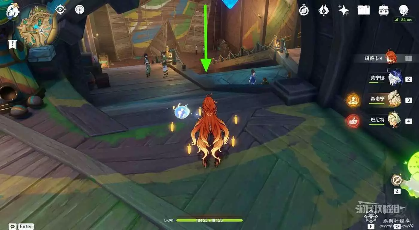 參考下圖綠色箭頭標記,從傳送錨點所在位置出發,沿路往小地圖西南邊走。在第一個岔路口右轉。