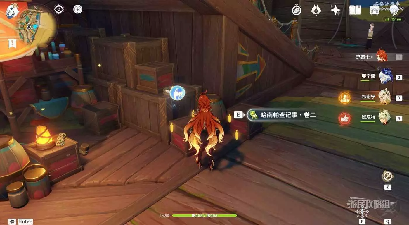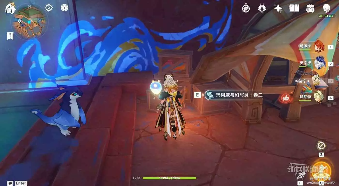 站在流泉之眾聲望NPC旁邊往小地圖北邊看,可以看到前方高台右側有很長的木制樓梯,在樓梯下方可以拾取到【瑪阿威和幻寫靈·卷一】。