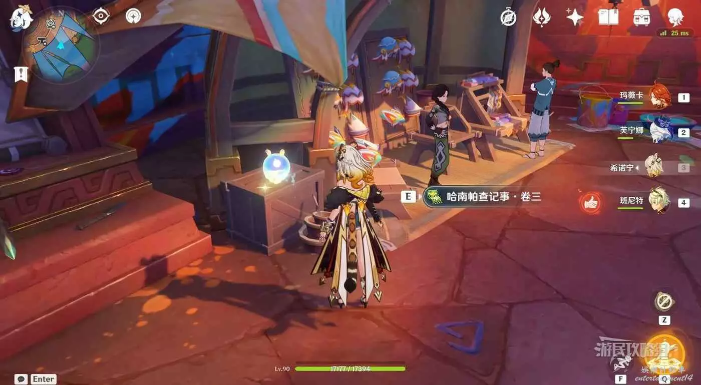 在樓梯底部左側第一個攤位旁邊有個木箱子,木箱子上有閃光點,互動即可拾取【哈南帕查記事·卷三】。