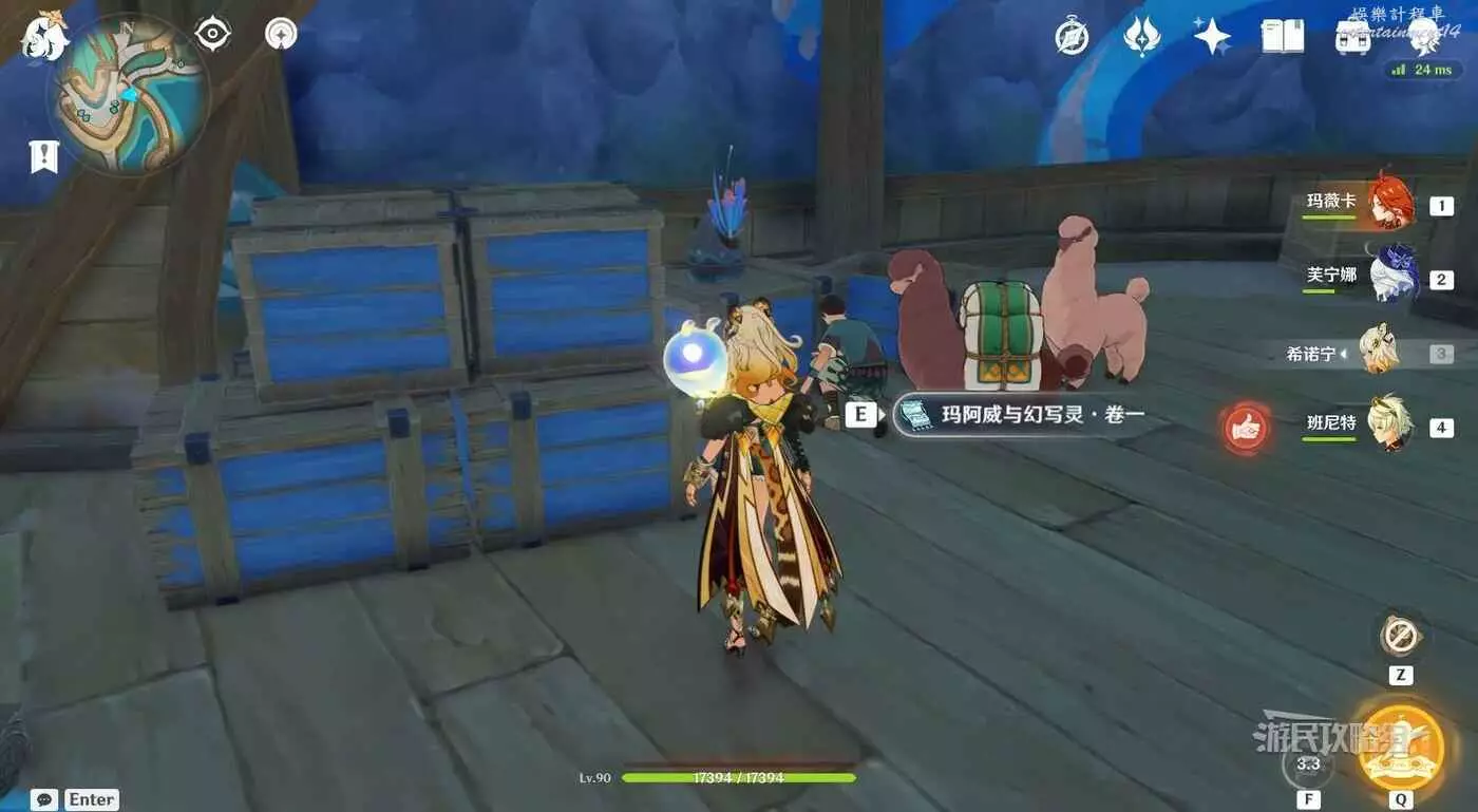 到達第二個岔路口之後,站在路口不要動,往左側路邊的木箱子上看,可以看到閃光點,互動拾取【瑪阿威和幻寫靈·卷三】。