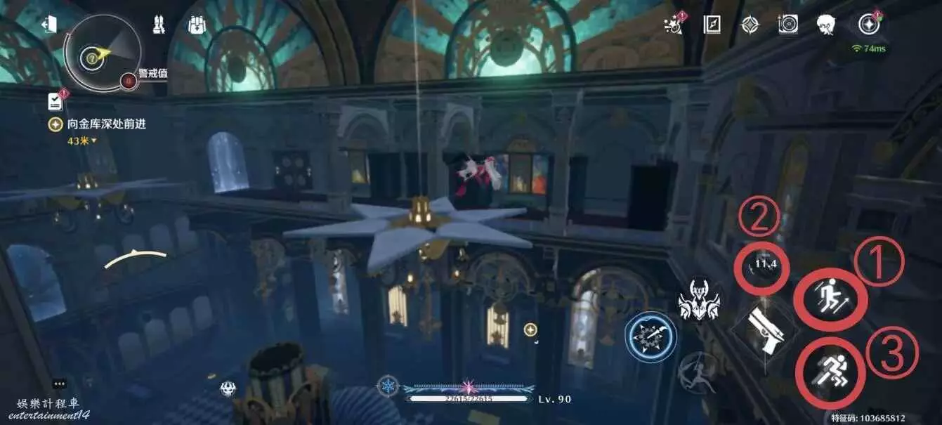 可原路返回開遺漏寶箱,如上圖先跳躍①再鉤索②後速跑/閃避③(可借鑒方法)即可到達吊燈,再用如上述可借鑒方法跳至對面原路返回
