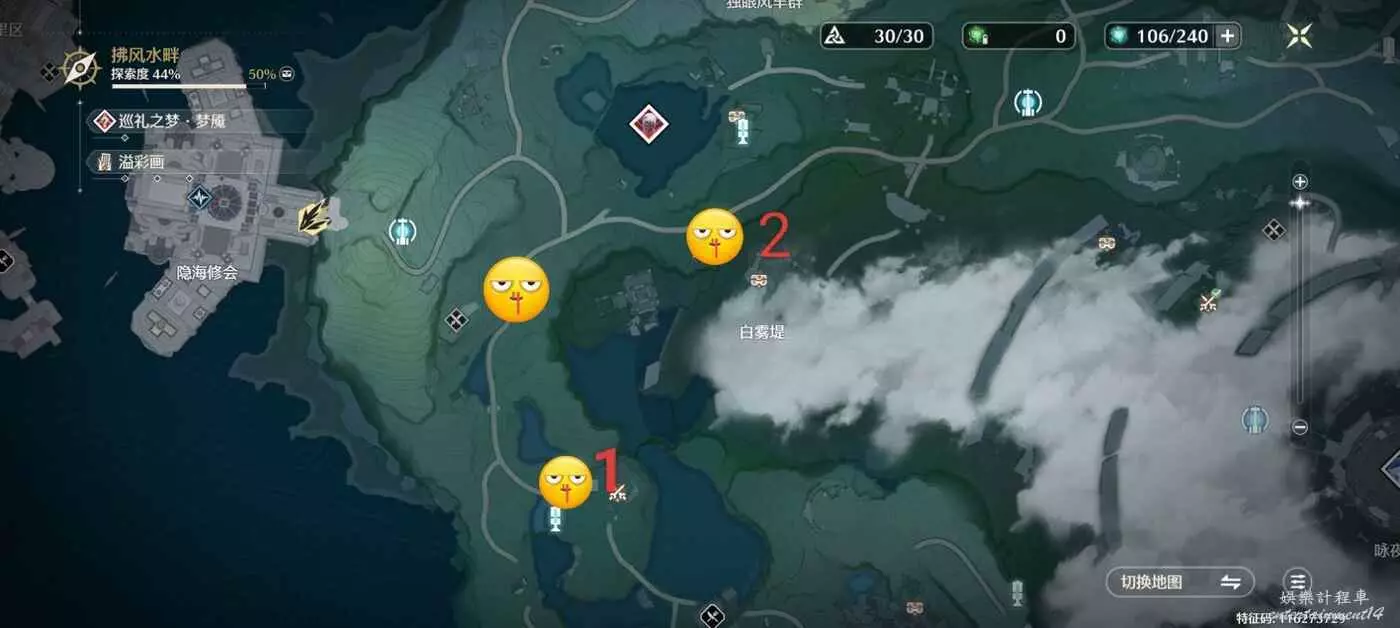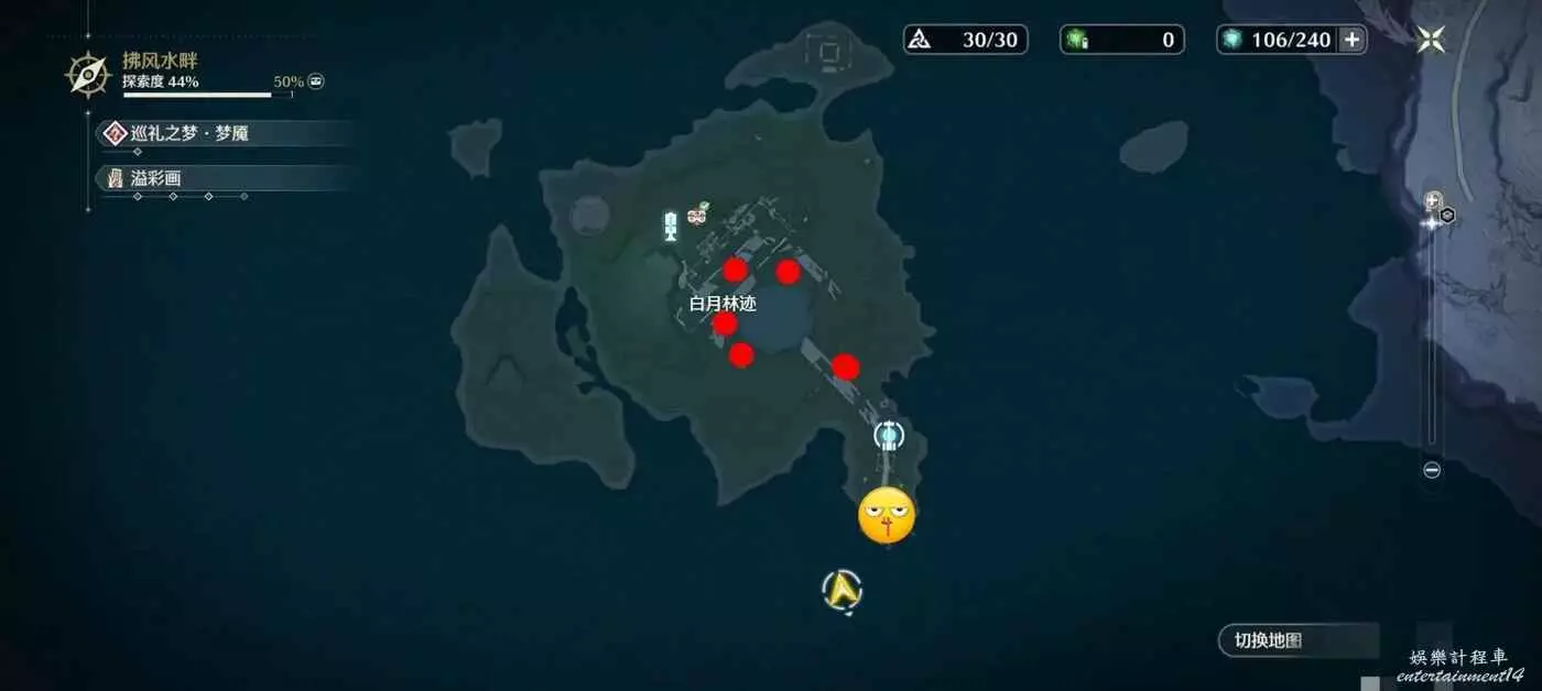 在白月林跡五個紅點位置會有五個劍塚,分別需要交付五把劍插進去。五個小黃人兒代表這五把劍獲取的位置,沒有編號的地方直接過去遇見劍士捶死即可獲得。