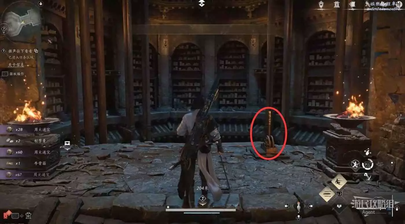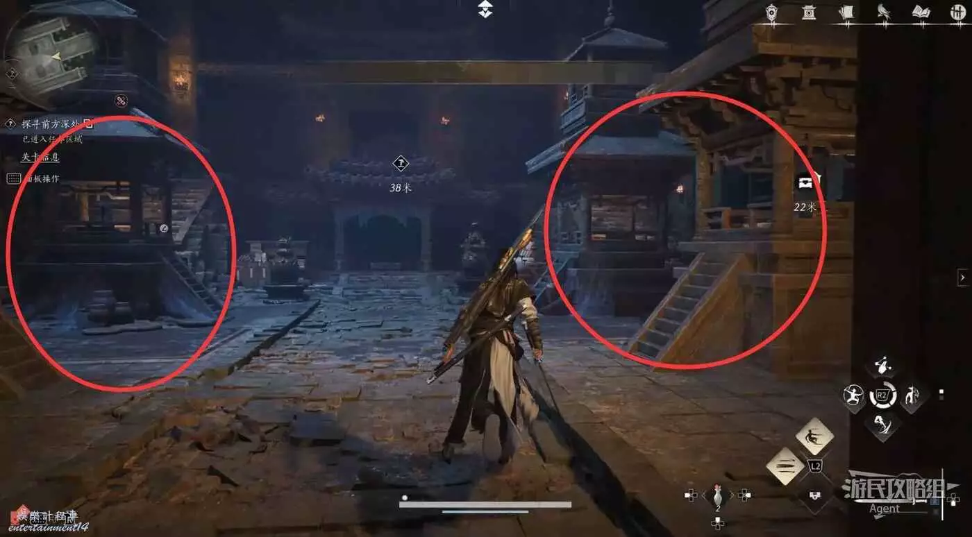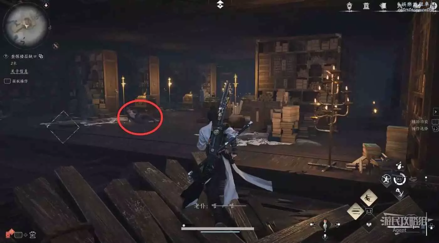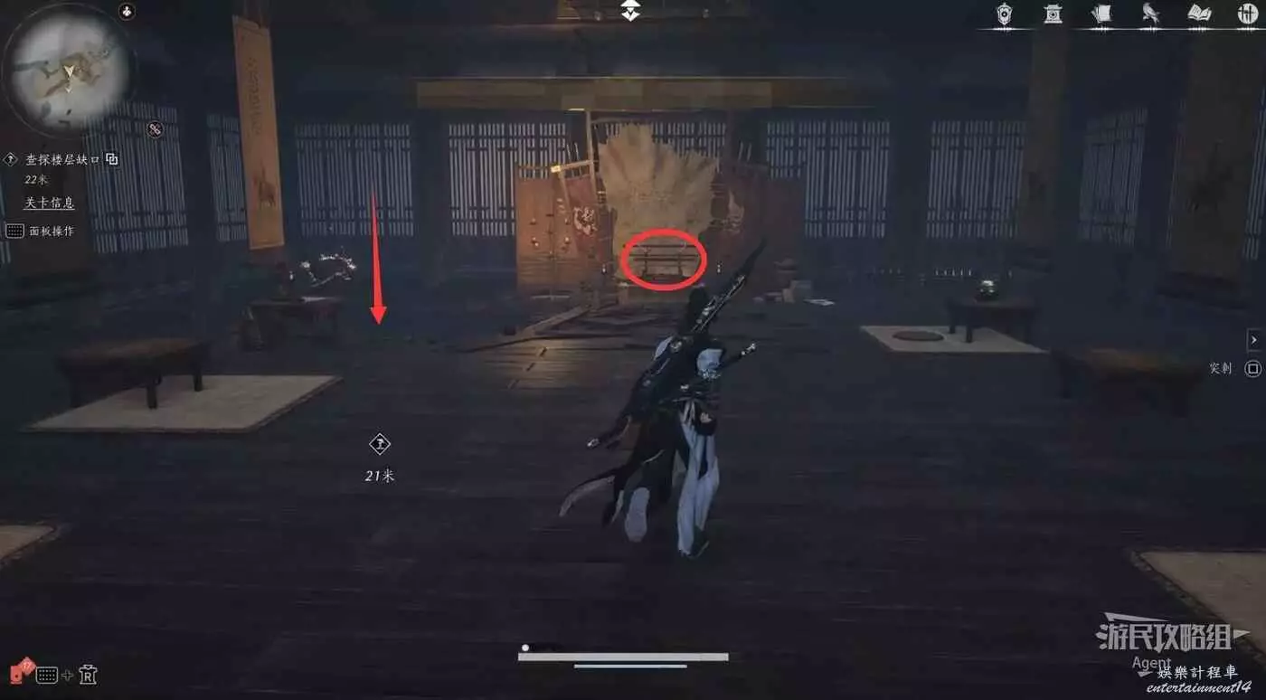 進入春秋別館,走樓梯上二樓拿到把弓,然後從旁邊的洞跳下去。