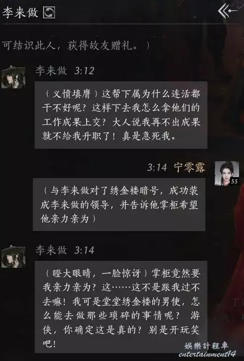 李來做:(與李來做對了繡金樓暗號,成功裝成李來做的領導,並告訴他掌櫃希望他親力親為)