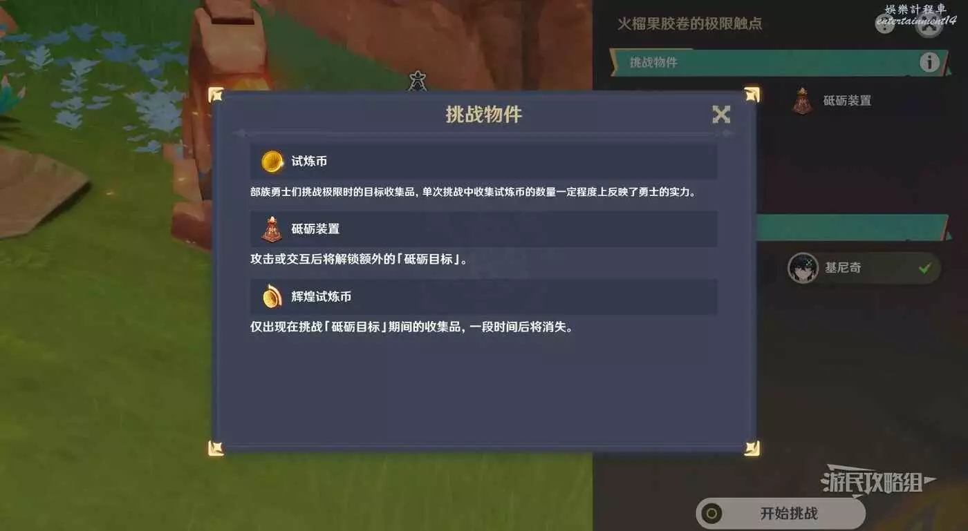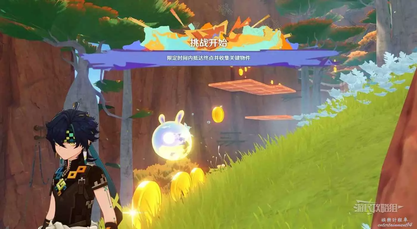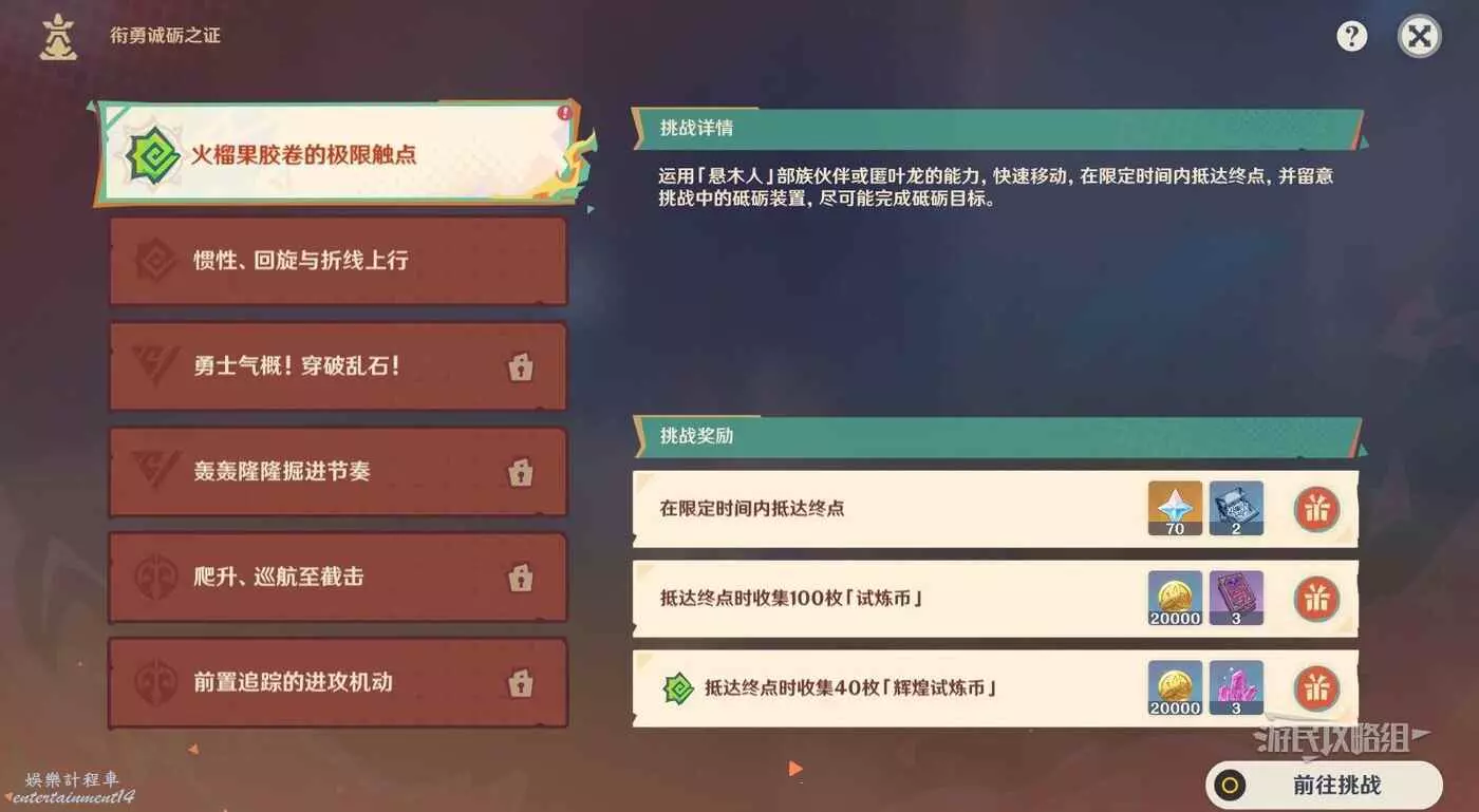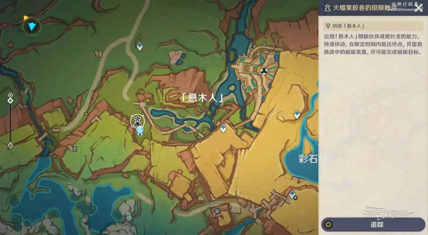 從右上角功能表打開活動介面,點擊挑戰詳情並選擇關卡即可在地圖上快速定位挑戰位置。第一關傳送到懸木人左下角的七天神像。