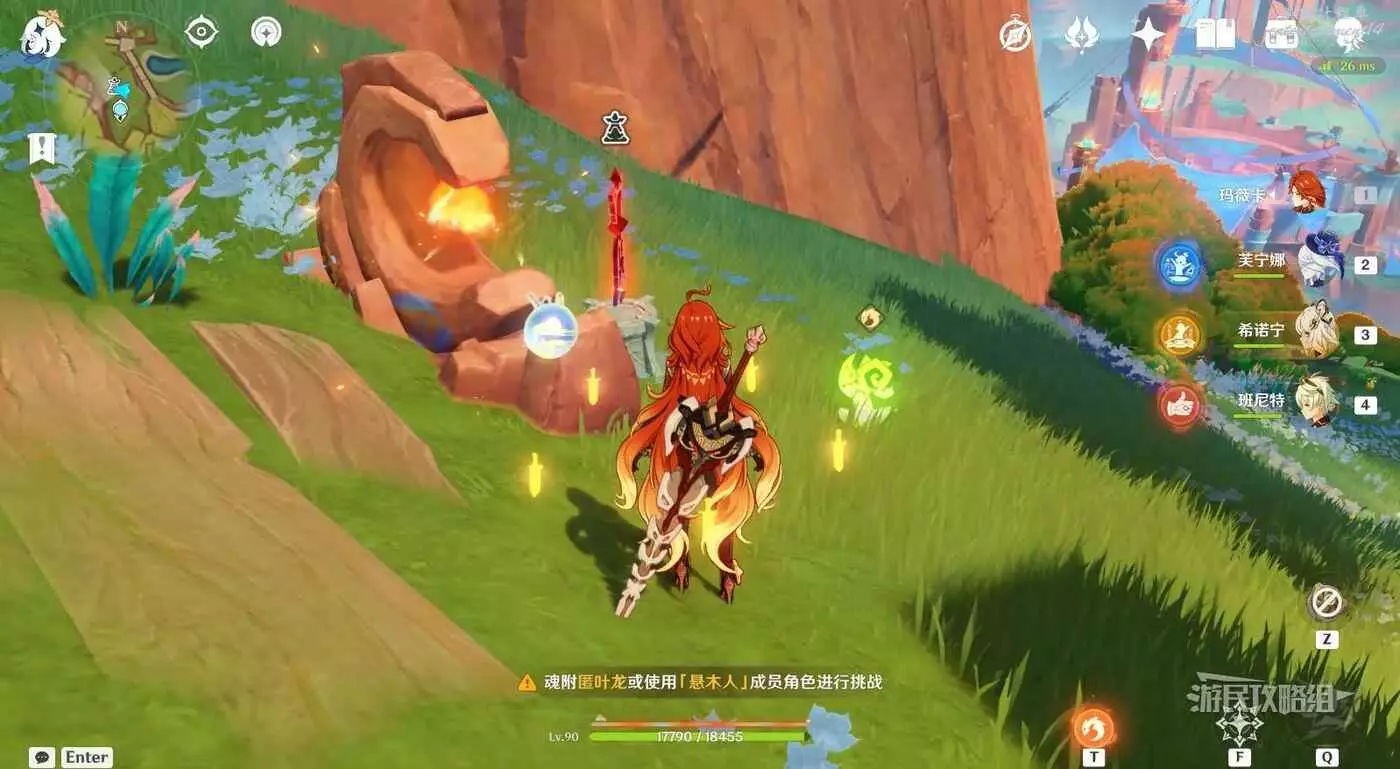在七天神像旁邊的下層可以看到挑戰裝置,提前與旁邊的匿葉龍標記互動,或使用基尼奇參與挑戰即可。