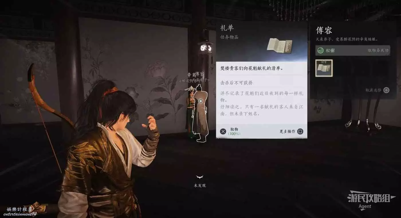 到醉花陰,從九流門弟子口中得知,他們要奪回寒姨的無面人名單,薛醜已經讓你去契丹人那偷來了機關匣,現在需要從南唐使者那奪回翻譯名單的陰文冊。(我們之前在清河活人醫館地下見過那些沒有換臉成功的無面人,換臉成功的已經派去契丹當間諜了,看來南唐派人血洗新手村時搶走了名單)