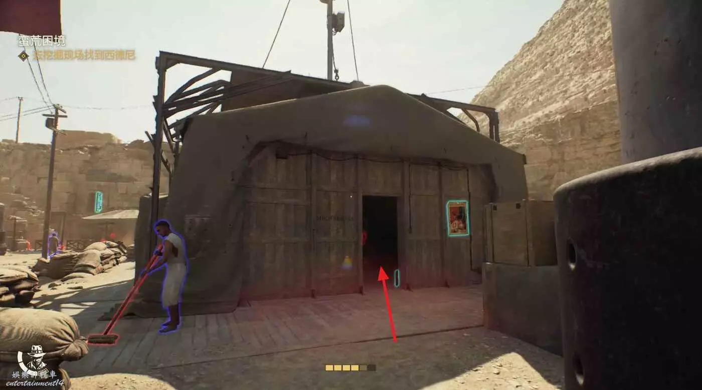 離開帳篷,跟隨箭頭進入左前方建築右下角的入口。