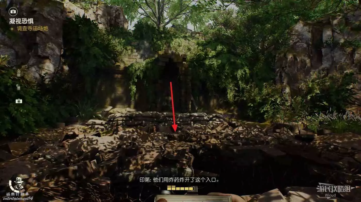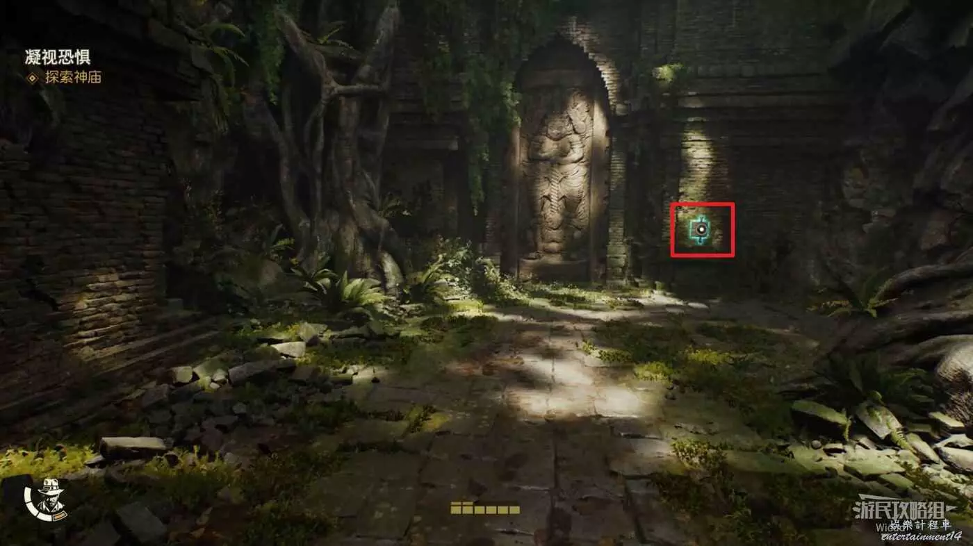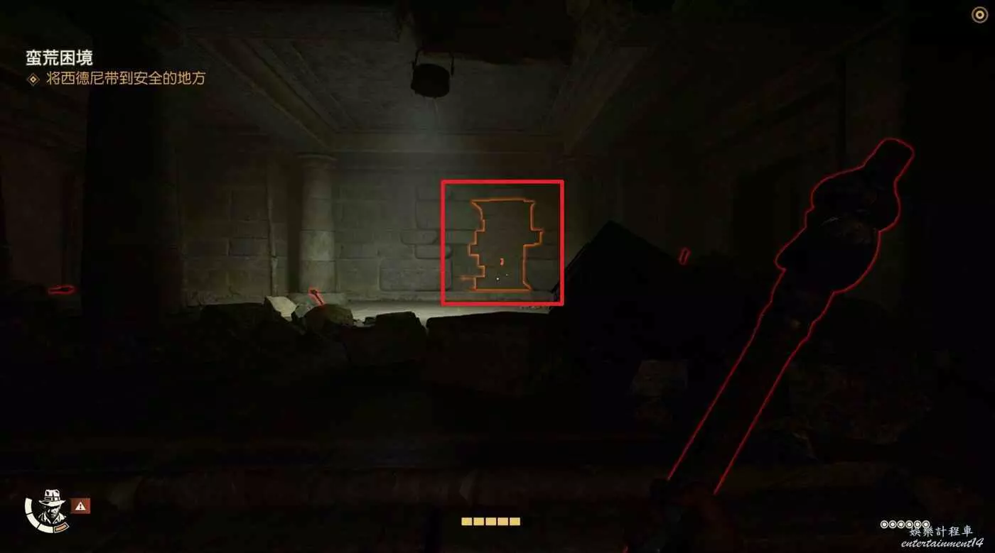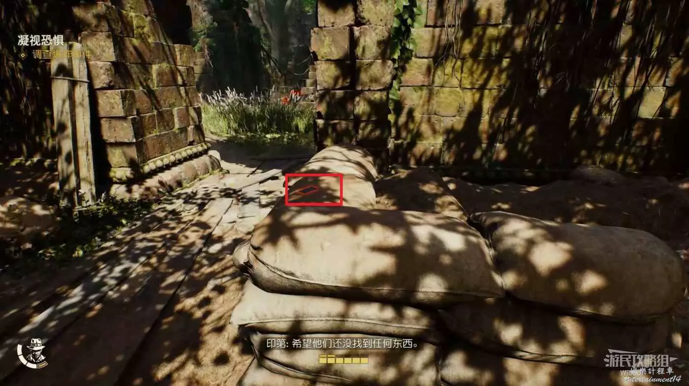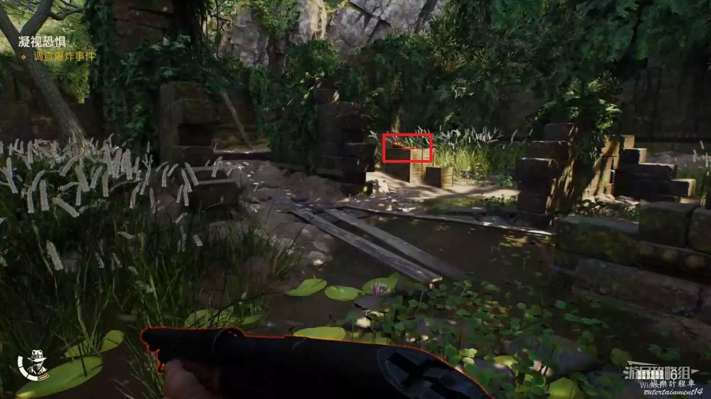 下圖右側紅框內有一個失落的文物可以拿,先走到右側的牆邊,用打火機點燃炸彈扔到紅框所示的雜草上。