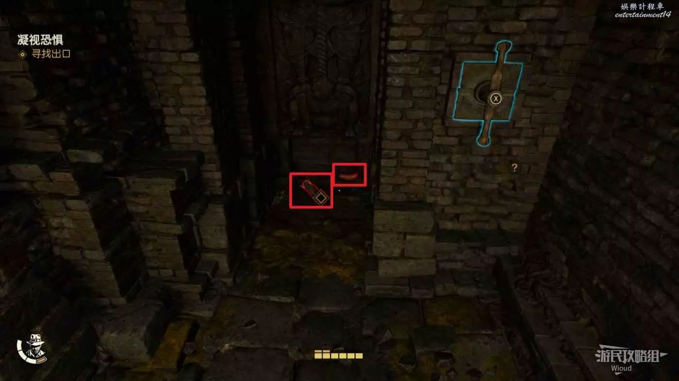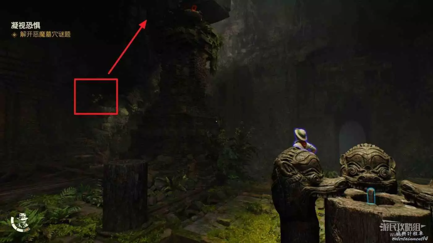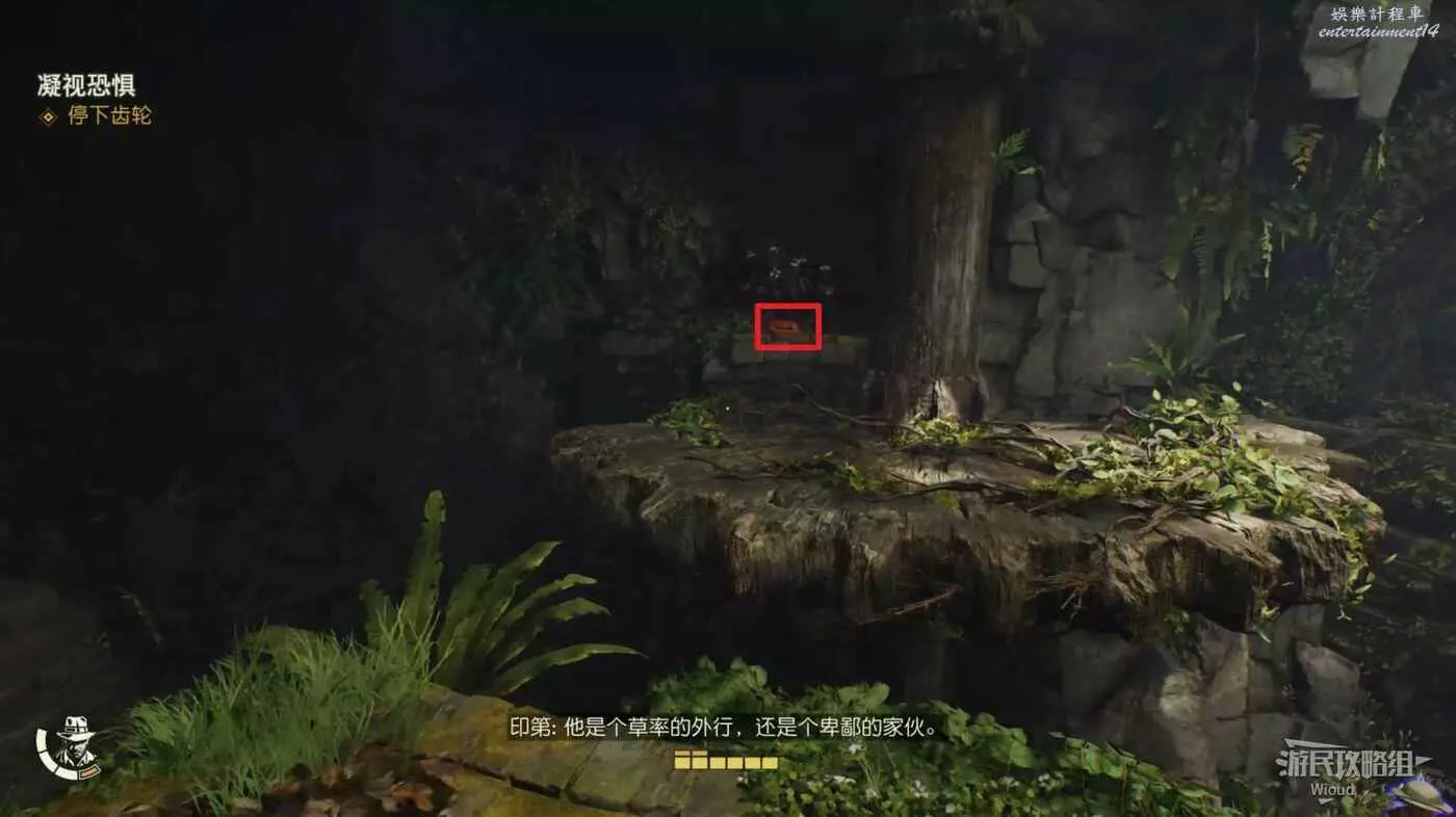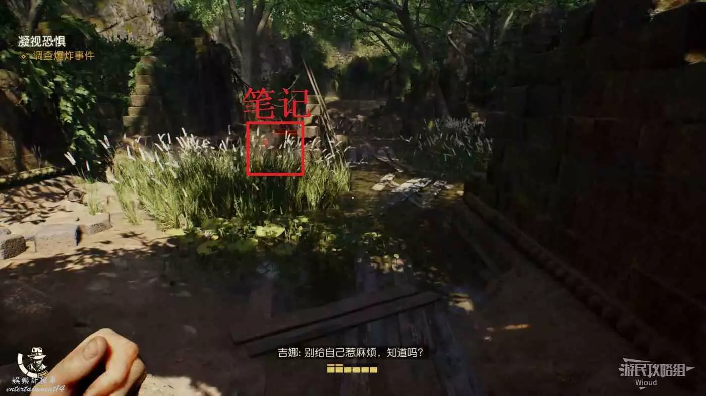 下圖右側紅框內有一個失落的文物可以拿,先走到右側的牆邊,用打火機點燃炸彈扔到紅框所示的雜草上。