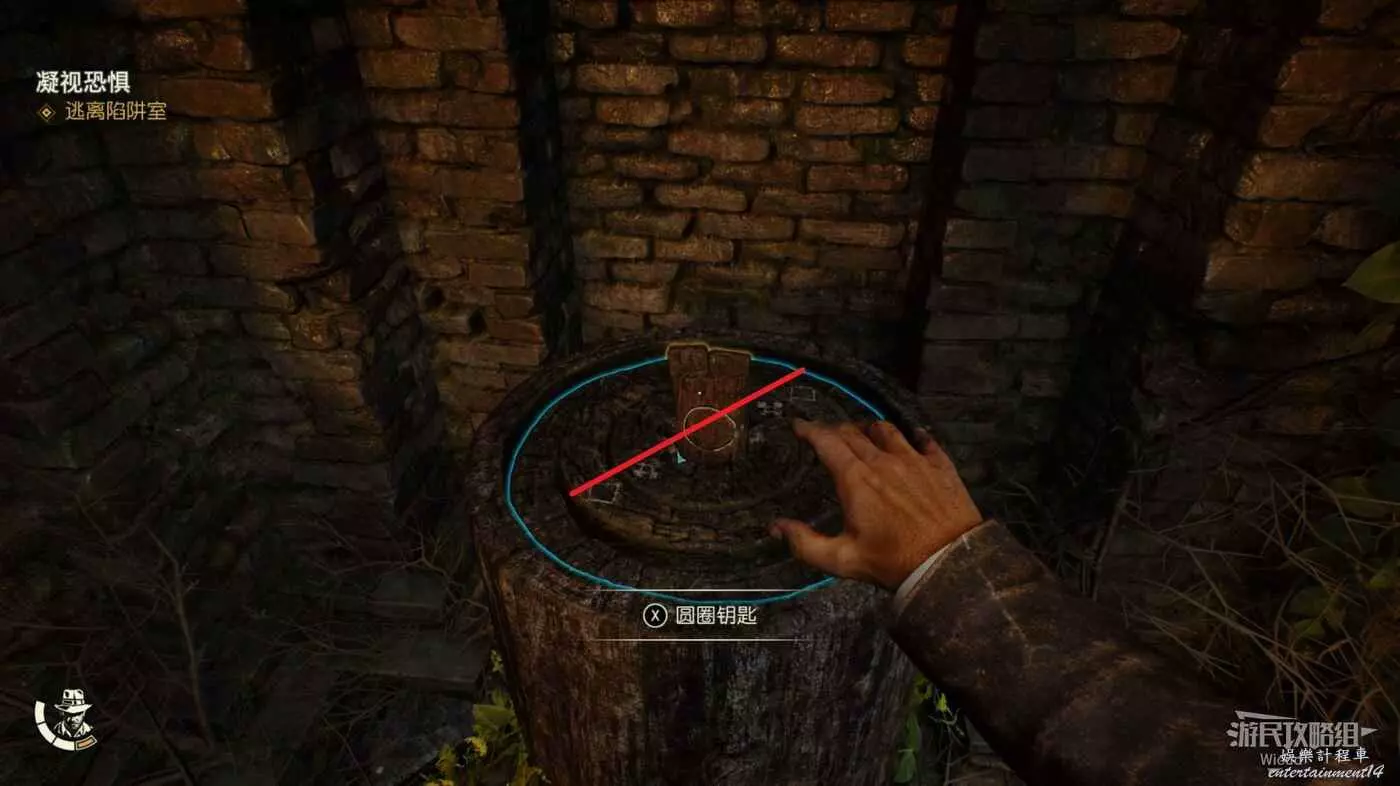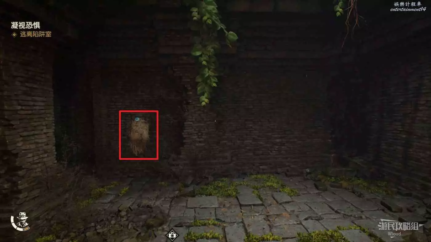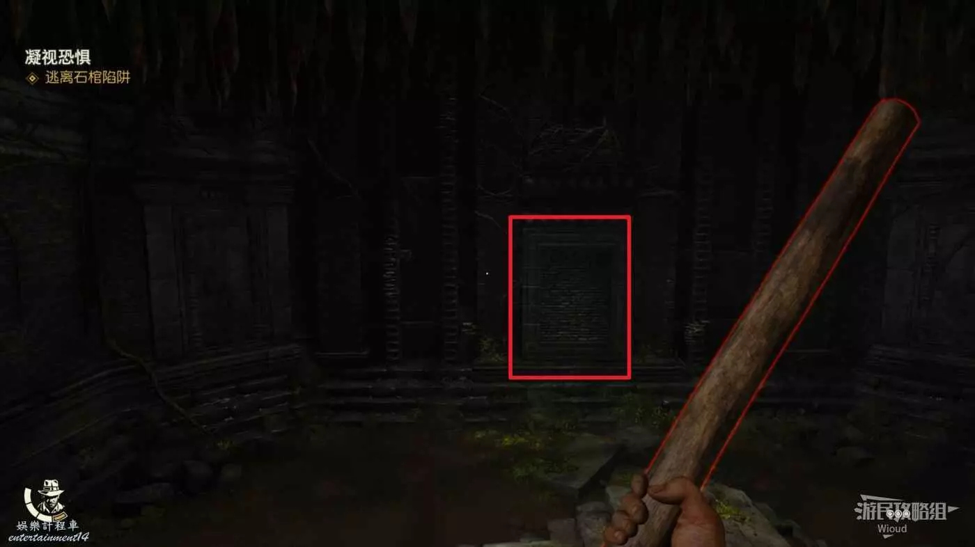 完成上述操作,暗門會開啟一條縫,鑽進去觸發一個新陷阱,這個陷阱運行到一半會停止,然後鑽到另一邊。
