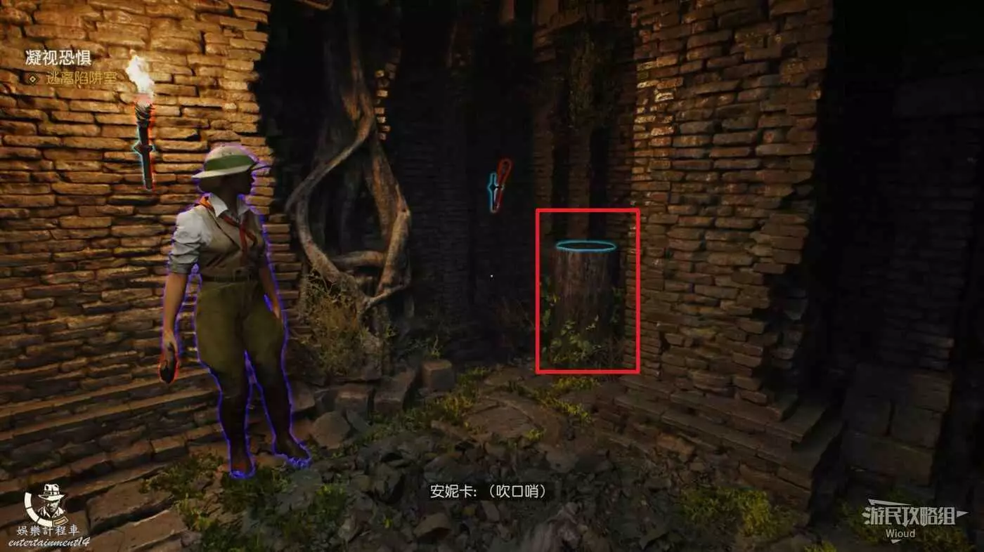 與自己的一個學生匯合後,先用打火機點燃右邊被雜草蓋住的開關。