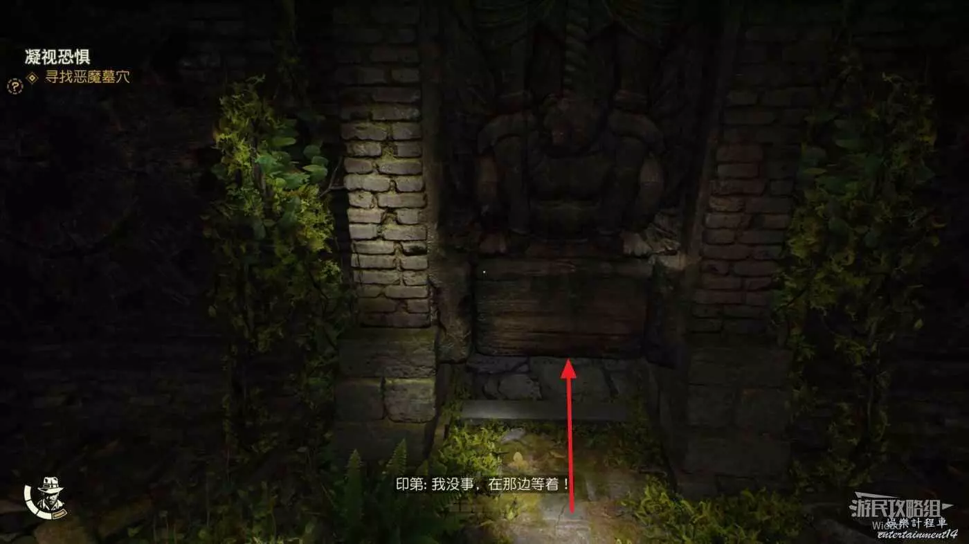 進入神廟內部,使用打火機點燃擋住洞口的木板,裡面有一個雕像,先拿出來。