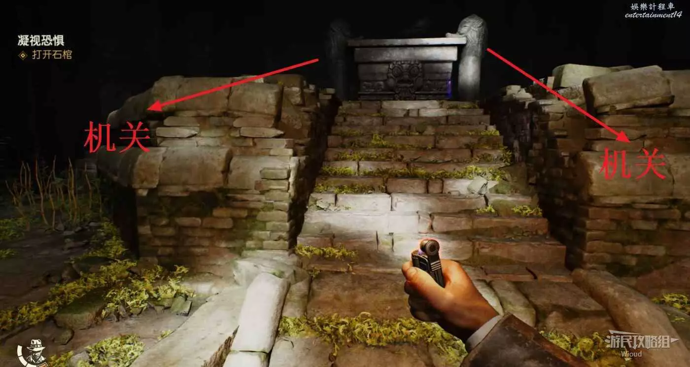 走到一個墓碑旁,先與墓碑左右兩個地方的開關互動,然後與墓碑互動將其推開。