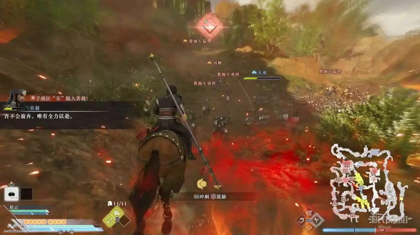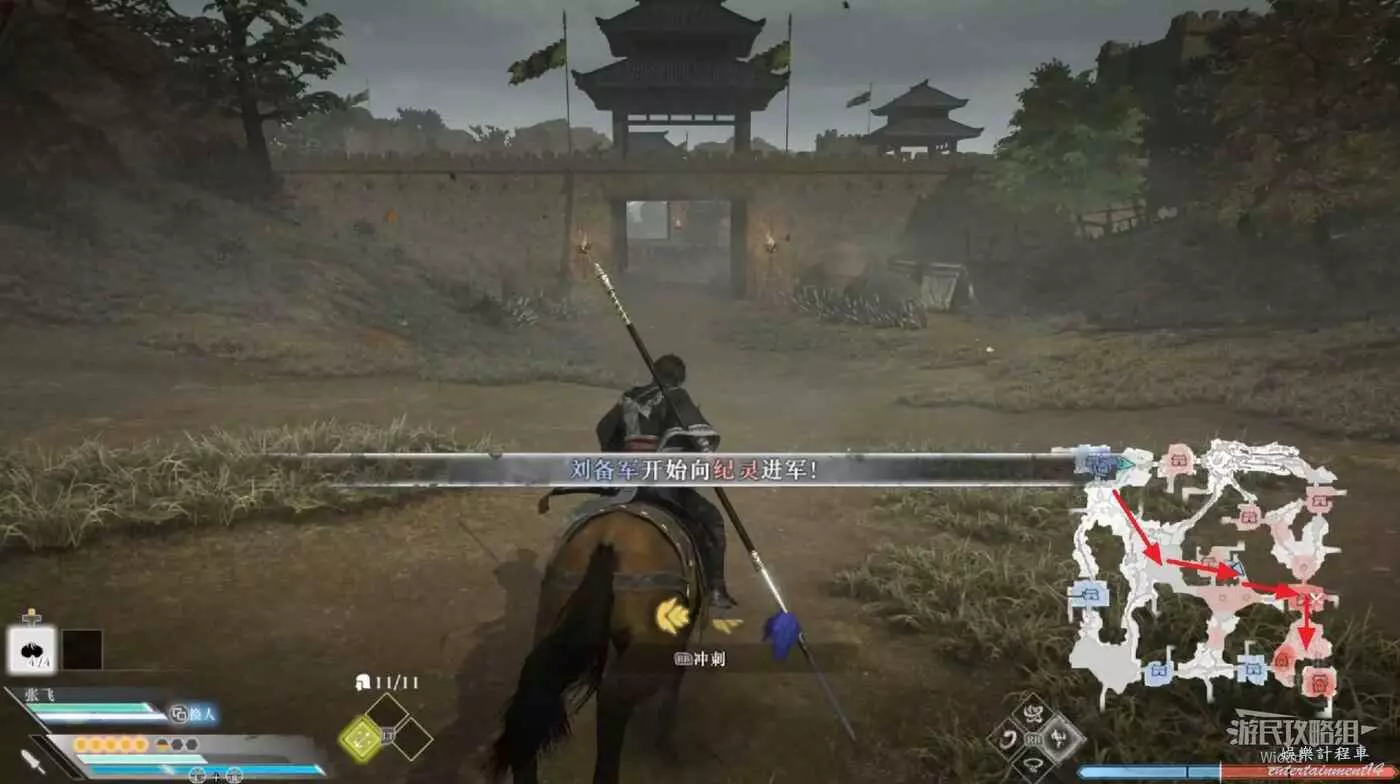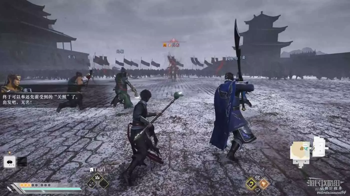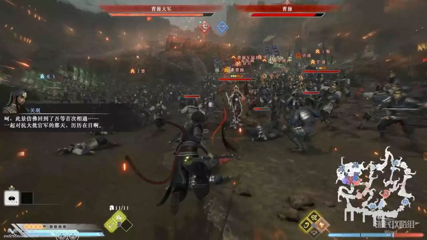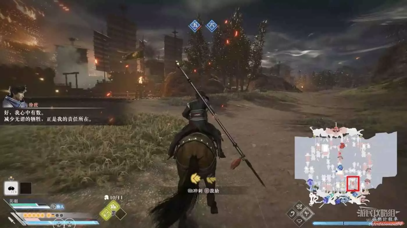 將城牆前方的士兵幹掉後,會有一個BOSS血條的官兵隊長從城門裡出現,將他幹掉完成序章的戰鬥,與關羽在篝火旁交談,進入第一章。
