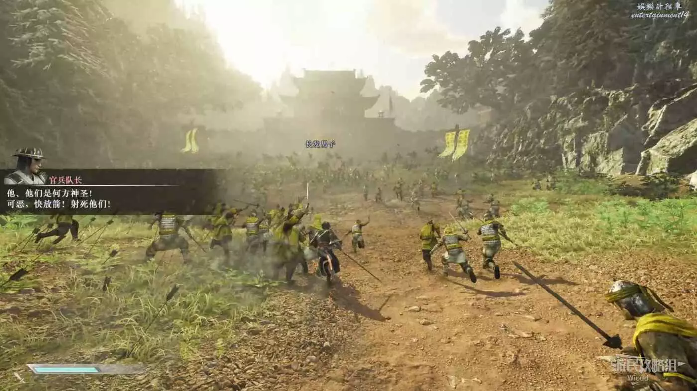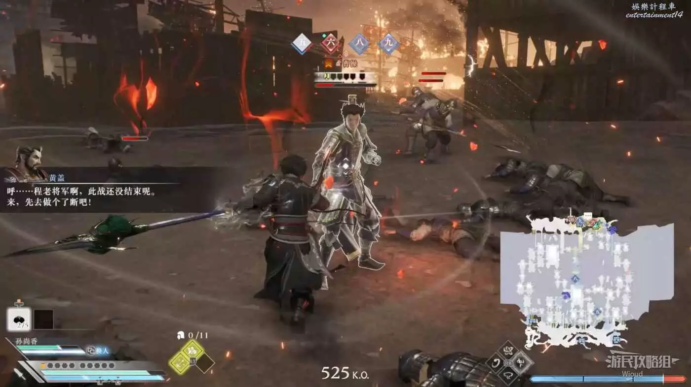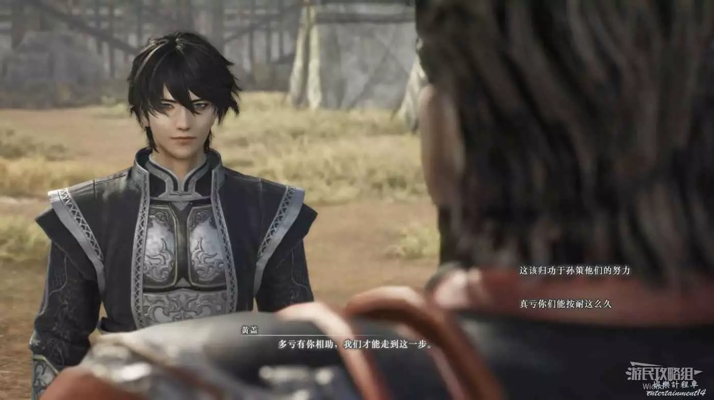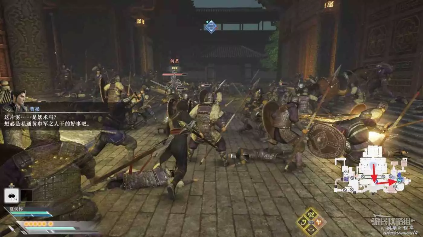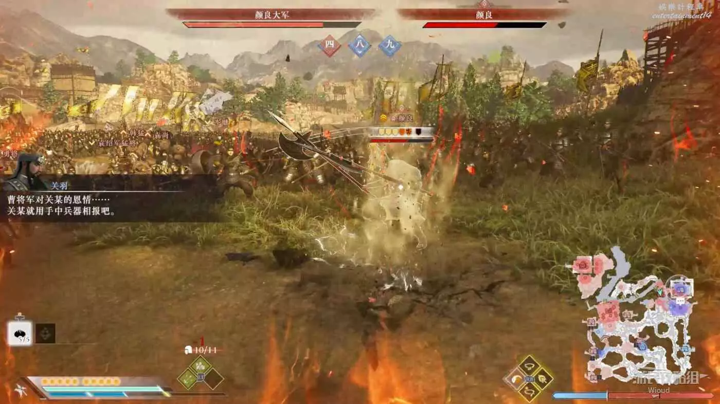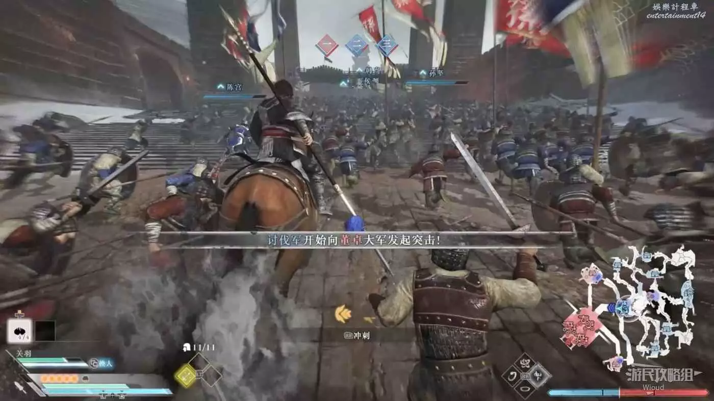 將城牆前方的士兵幹掉後,會有一個BOSS血條的官兵隊長從城門裡出現,將他幹掉完成序章的戰鬥,與關羽在篝火旁交談,進入第一章。