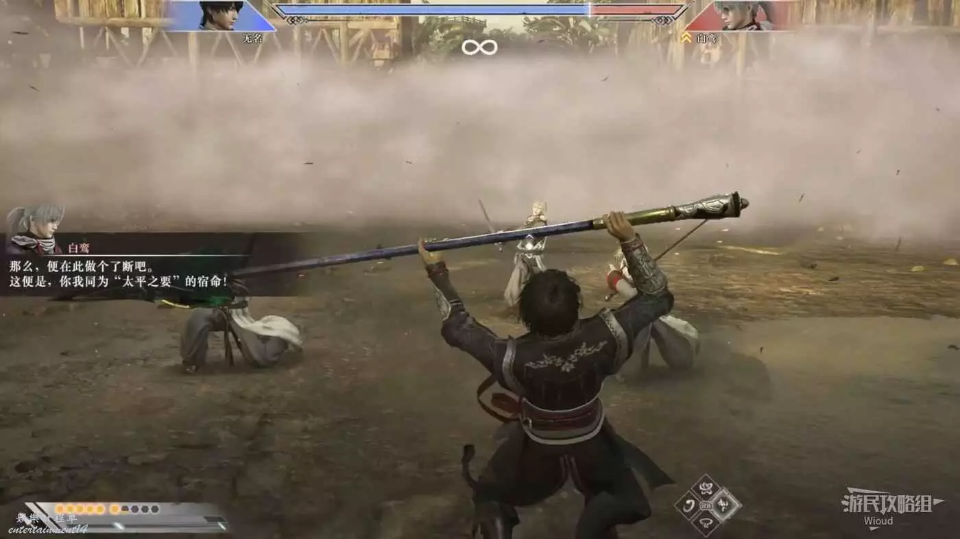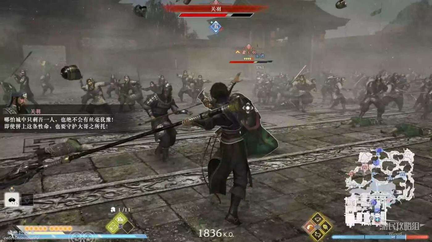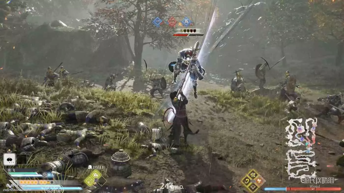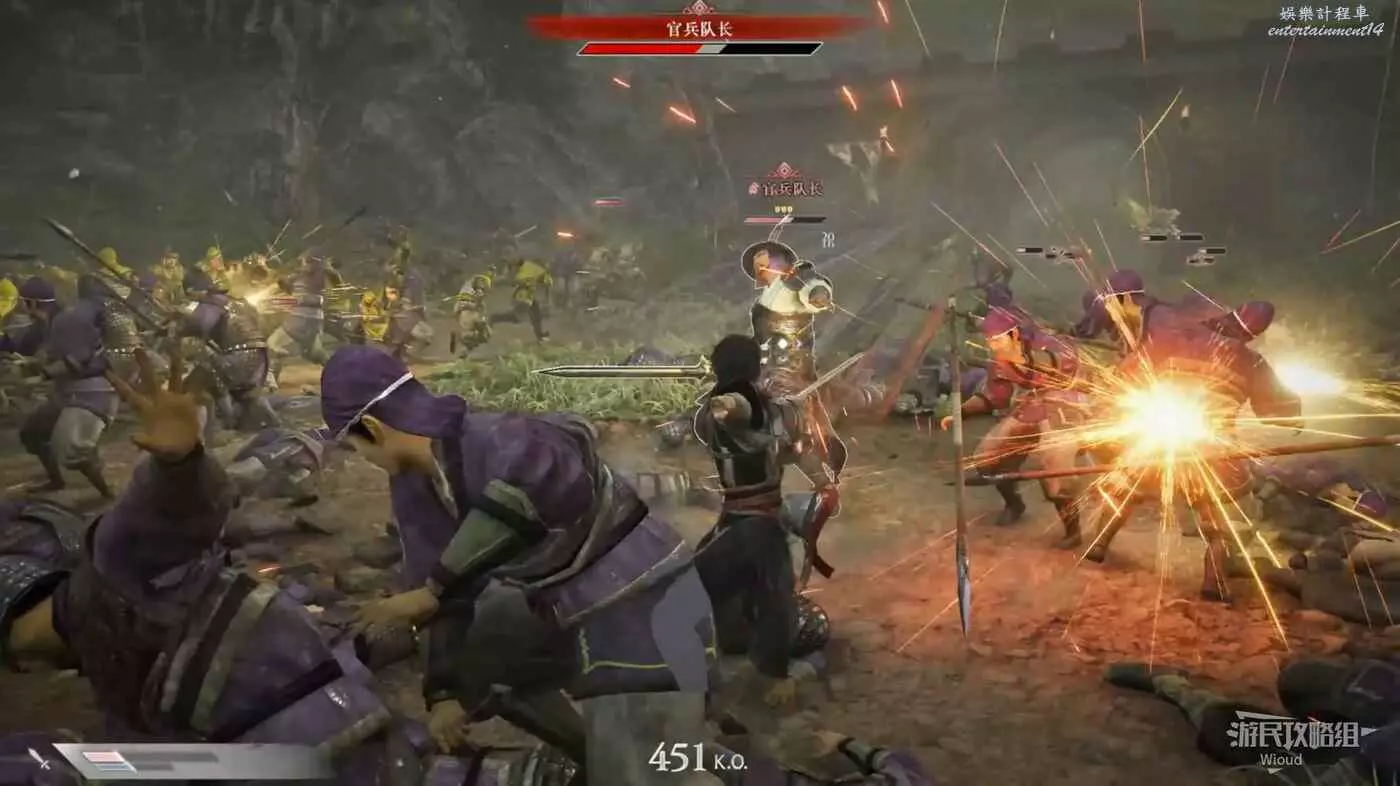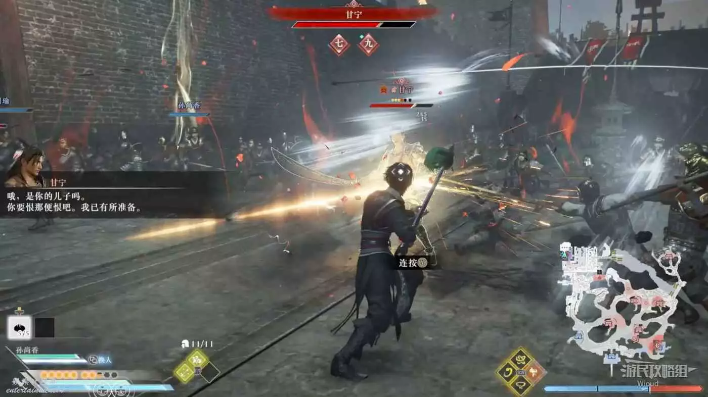 將城牆前方的士兵幹掉後,會有一個BOSS血條的官兵隊長從城門裡出現,將他幹掉完成序章的戰鬥,與關羽在篝火旁交談,進入第一章。