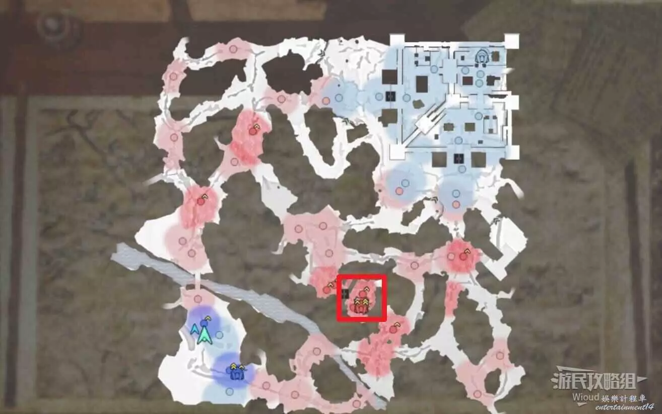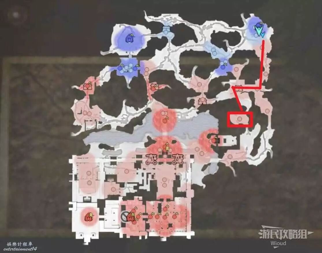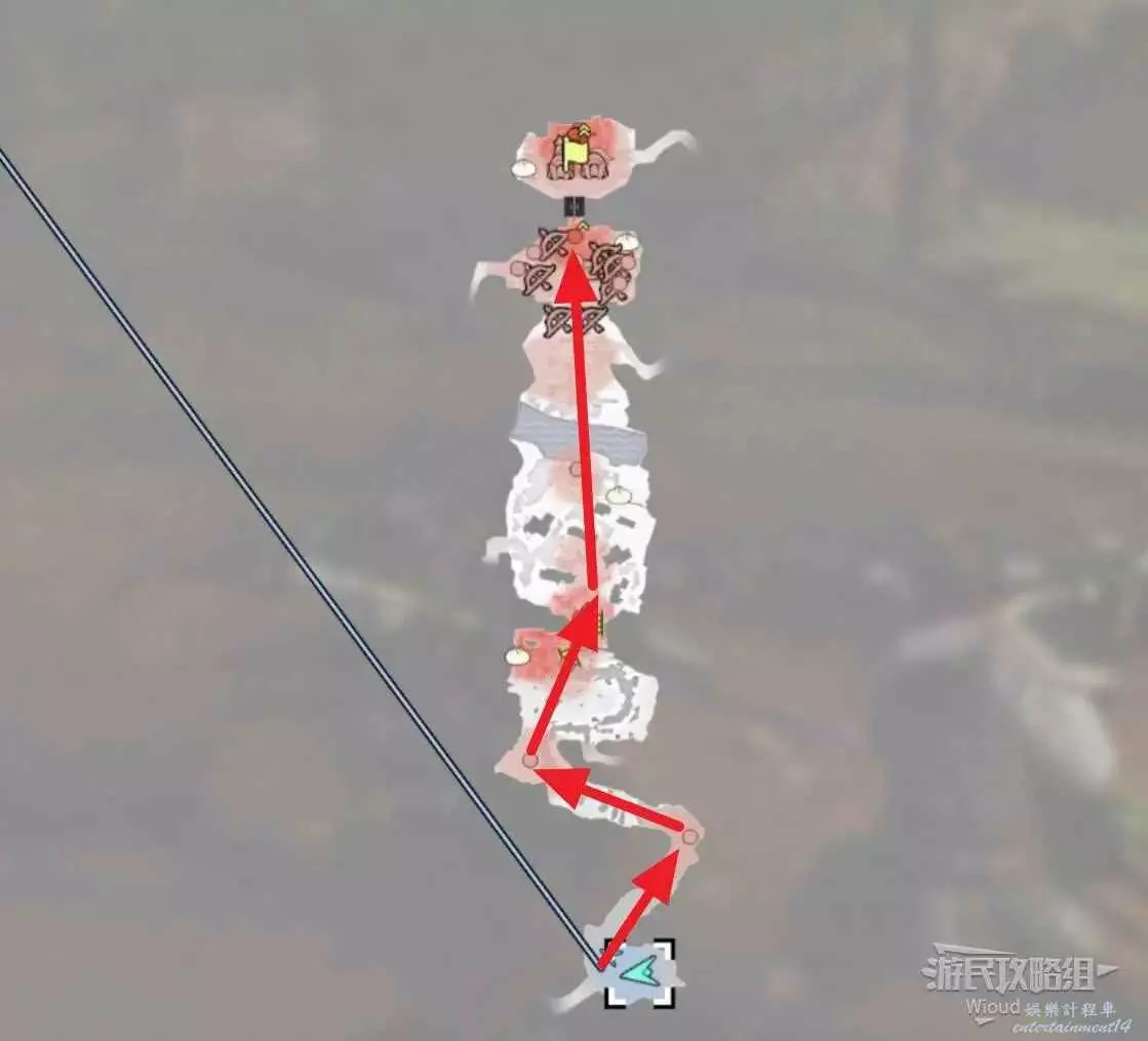 跟隨箭頭從區域下面的位置繞上去,中間是一個特別大的高台,沒法直接過去。