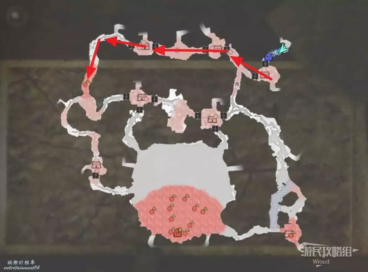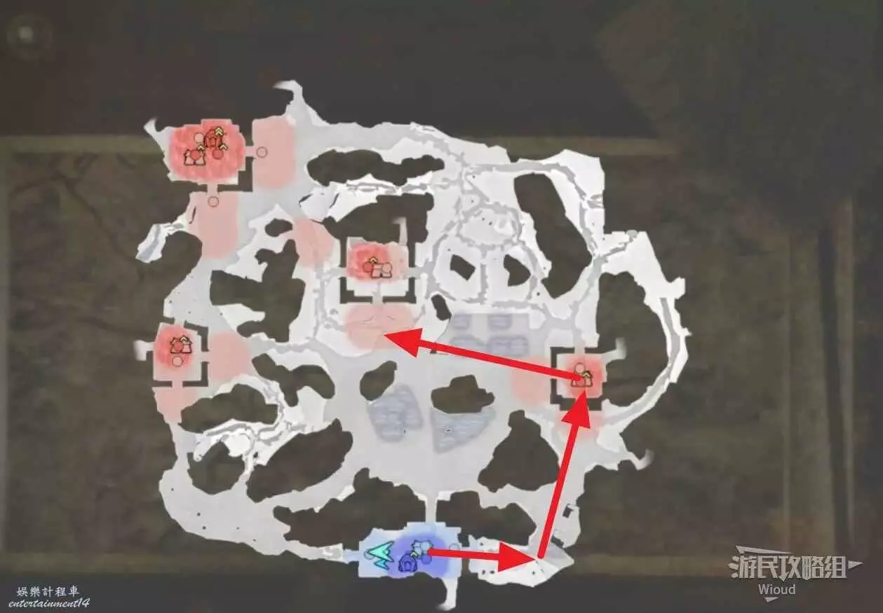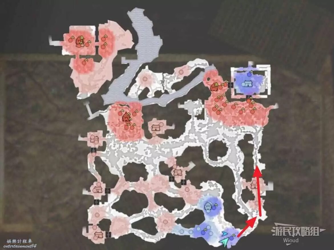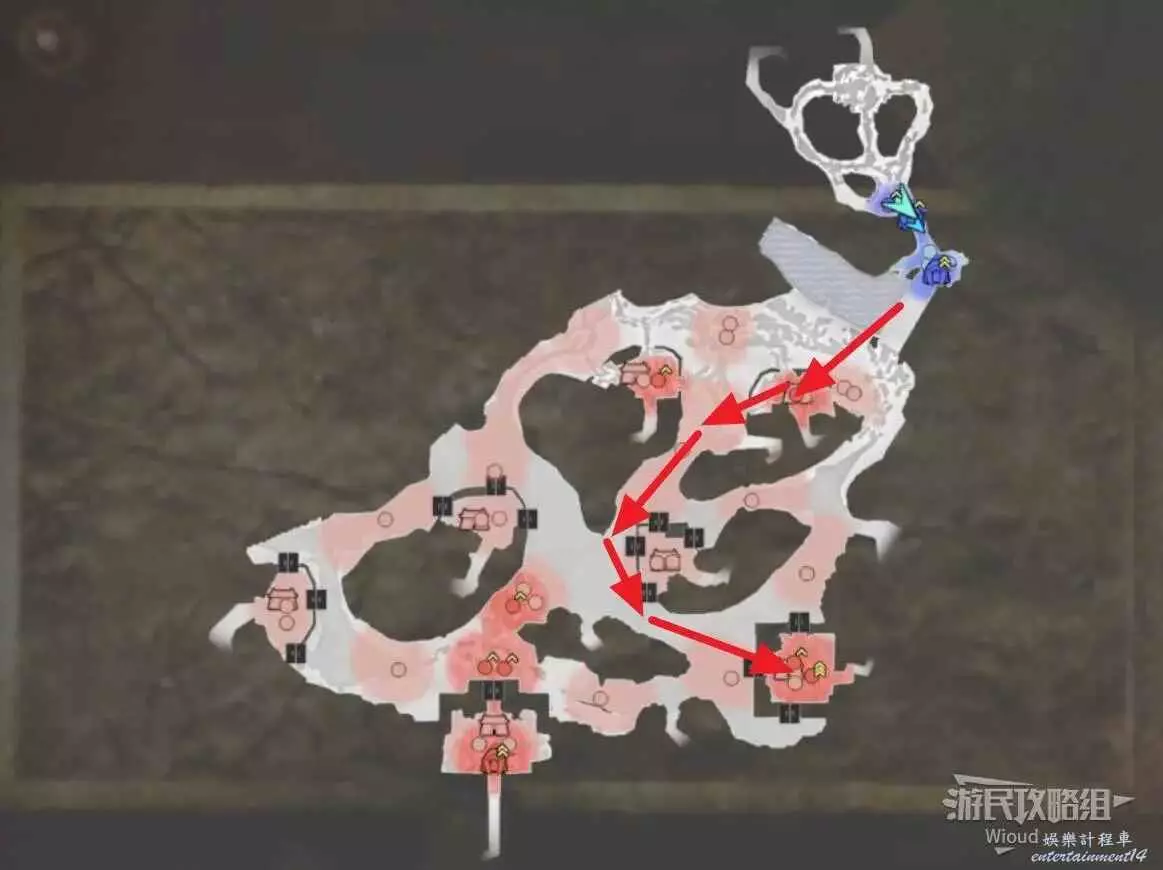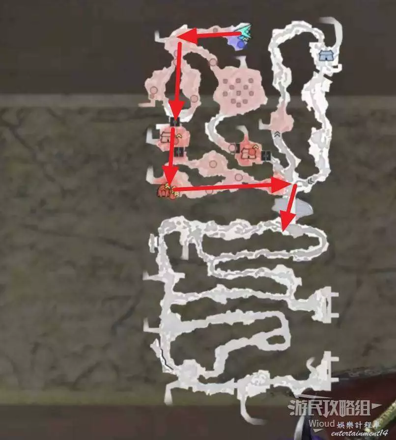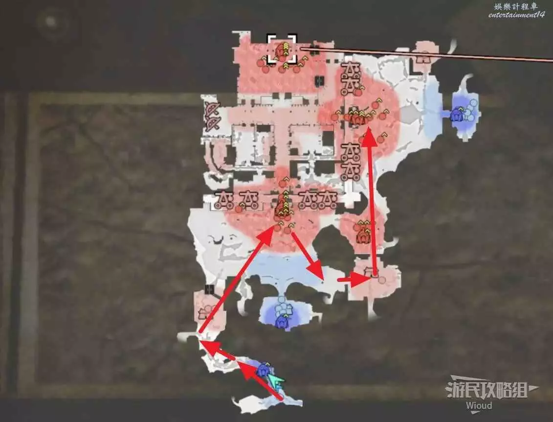 這場戰鬥的起點位於地圖左下角,這裡先往左邊的道路走,中間有一個岔路可以選擇兩條路線,下圖都為大家標註好了,擊敗沿途的所有敵人來到右上角區域。