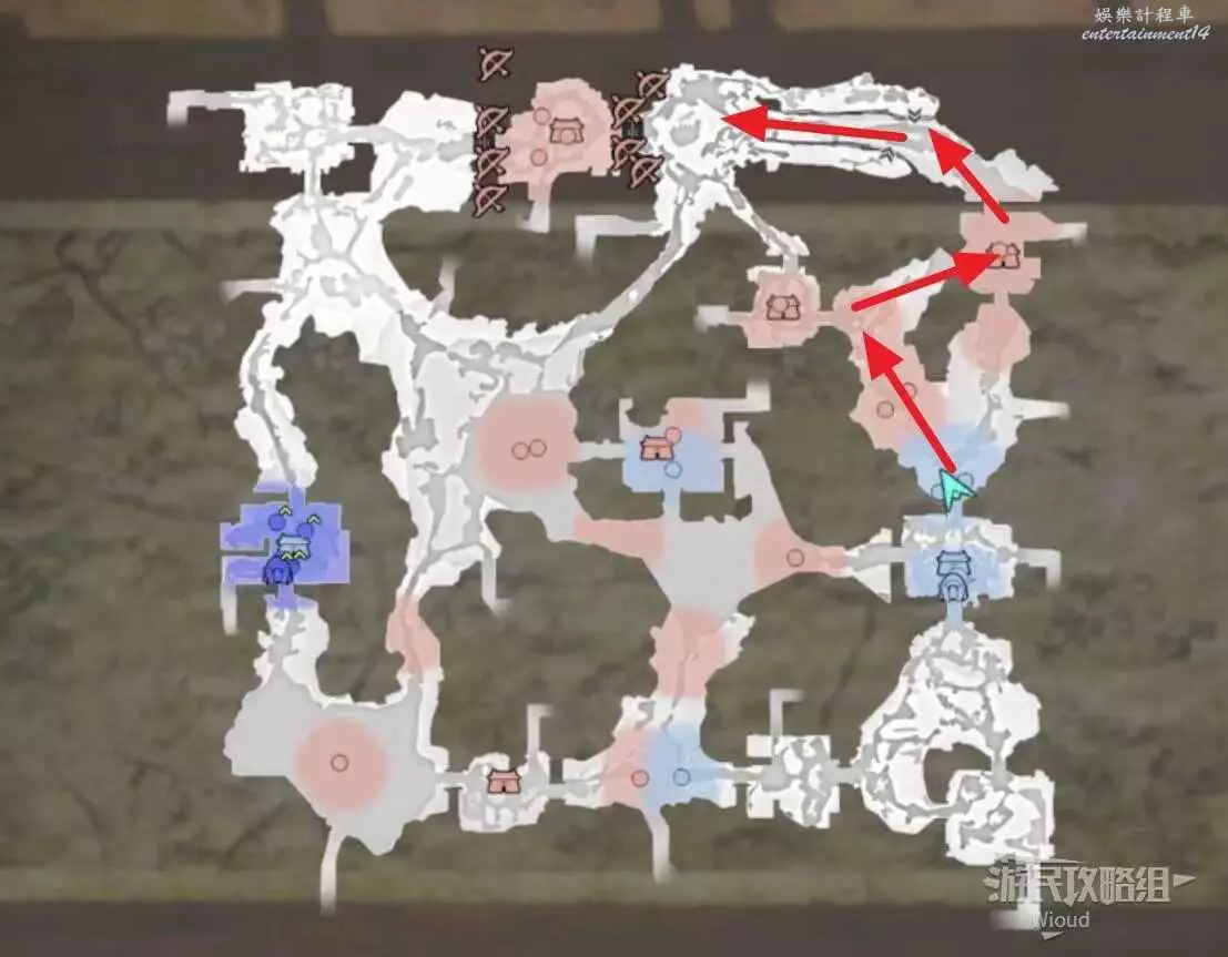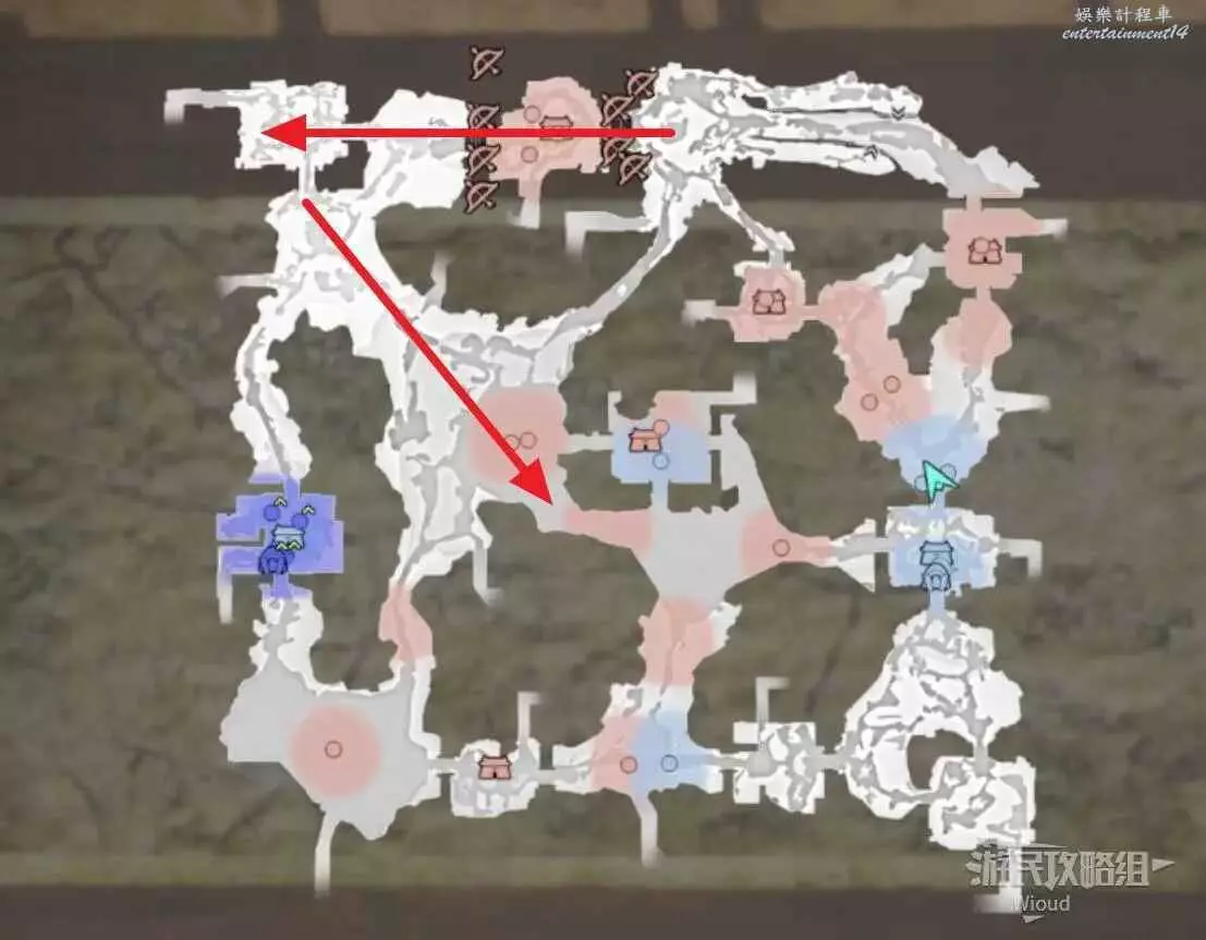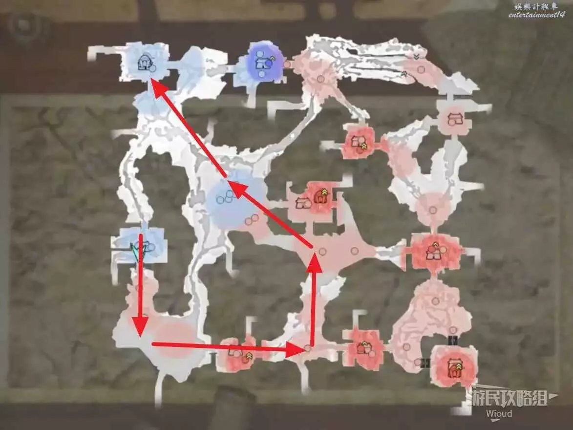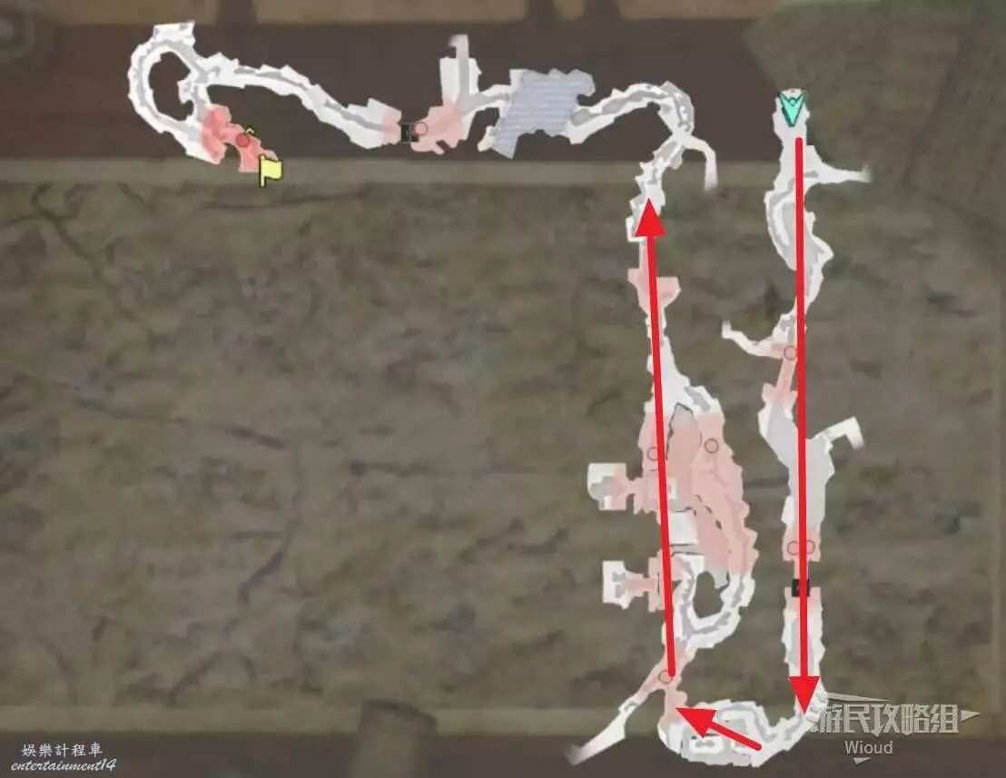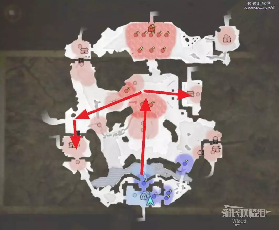 這場戰鬥的起點位於地圖左下角,這裡先往左邊的道路走,中間有一個岔路可以選擇兩條路線,下圖都為大家標註好了,擊敗沿途的所有敵人來到右上角區域。