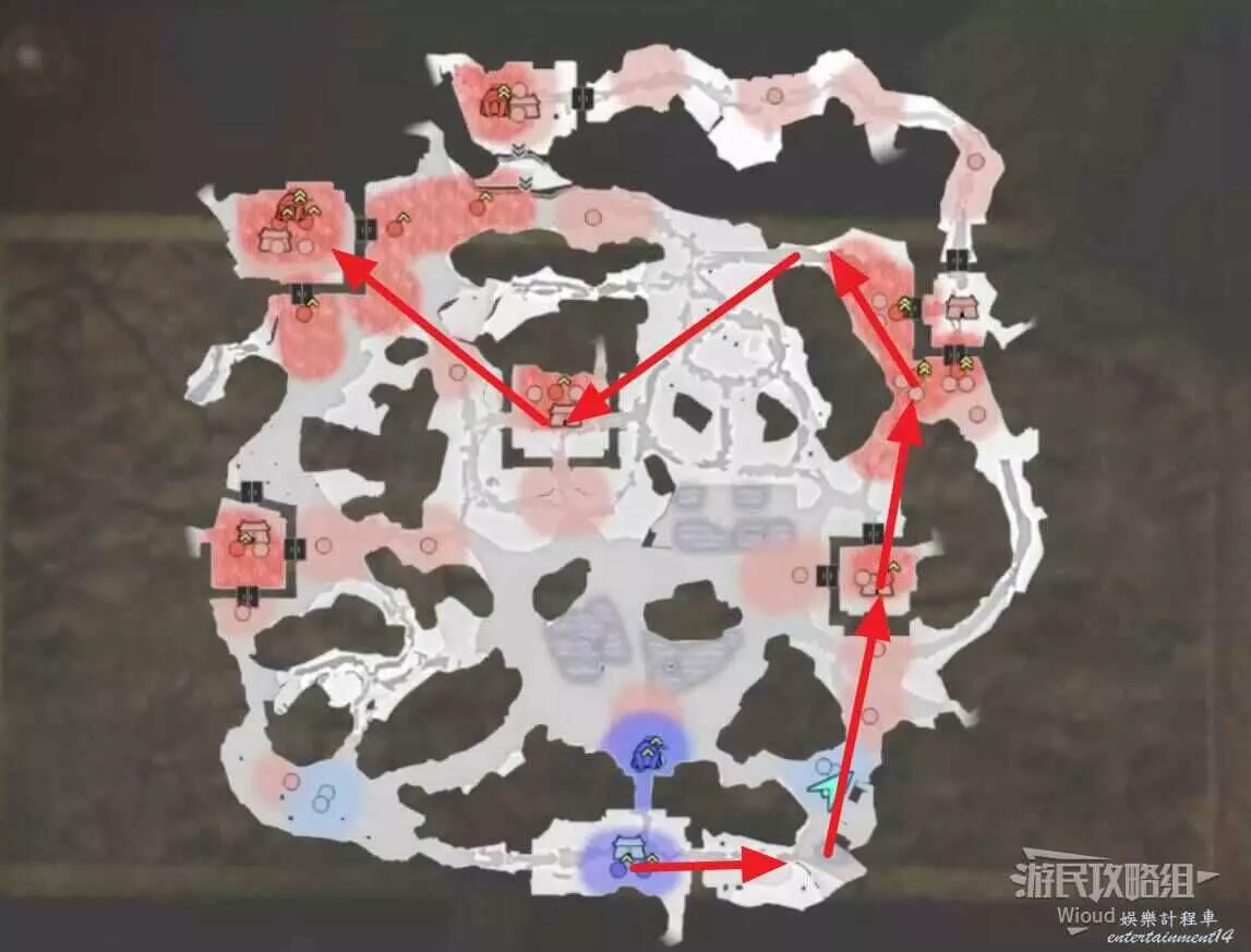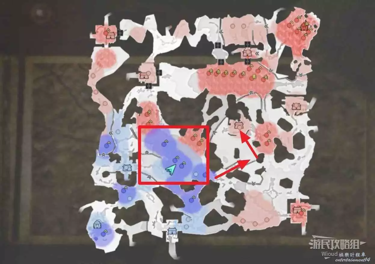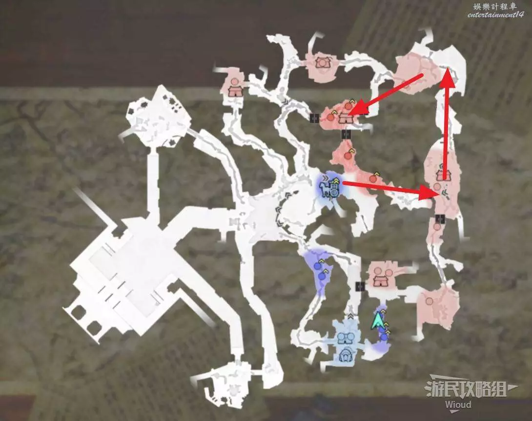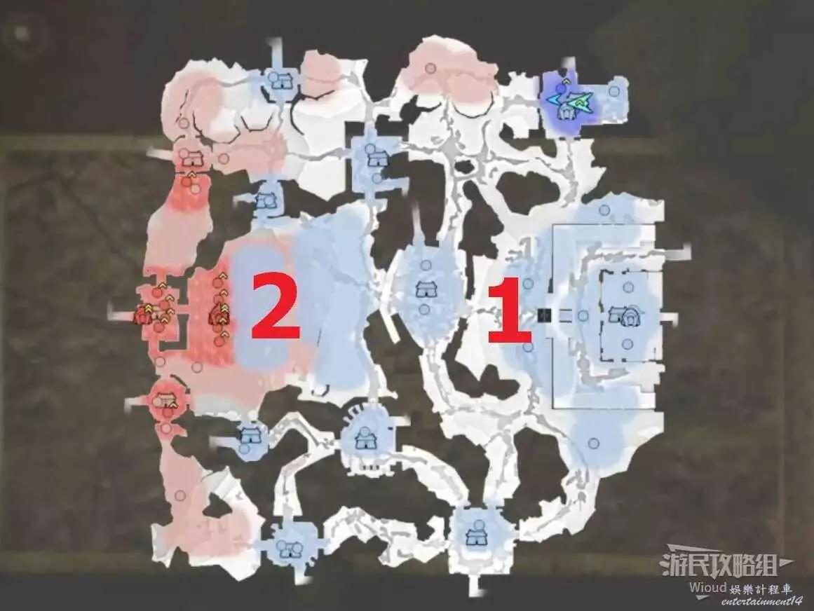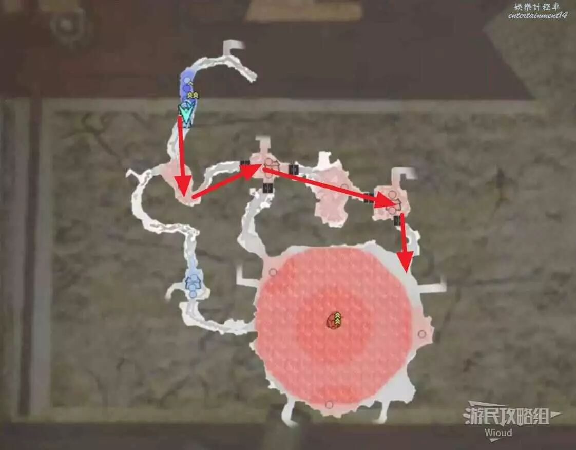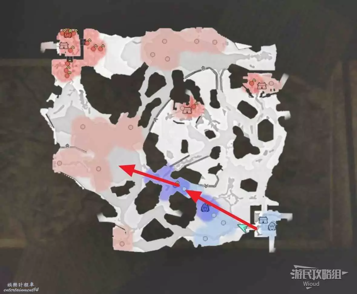 這場戰鬥的起點位於地圖左下角,這裡先往左邊的道路走,中間有一個岔路可以選擇兩條路線,下圖都為大家標註好了,擊敗沿途的所有敵人來到右上角區域。
