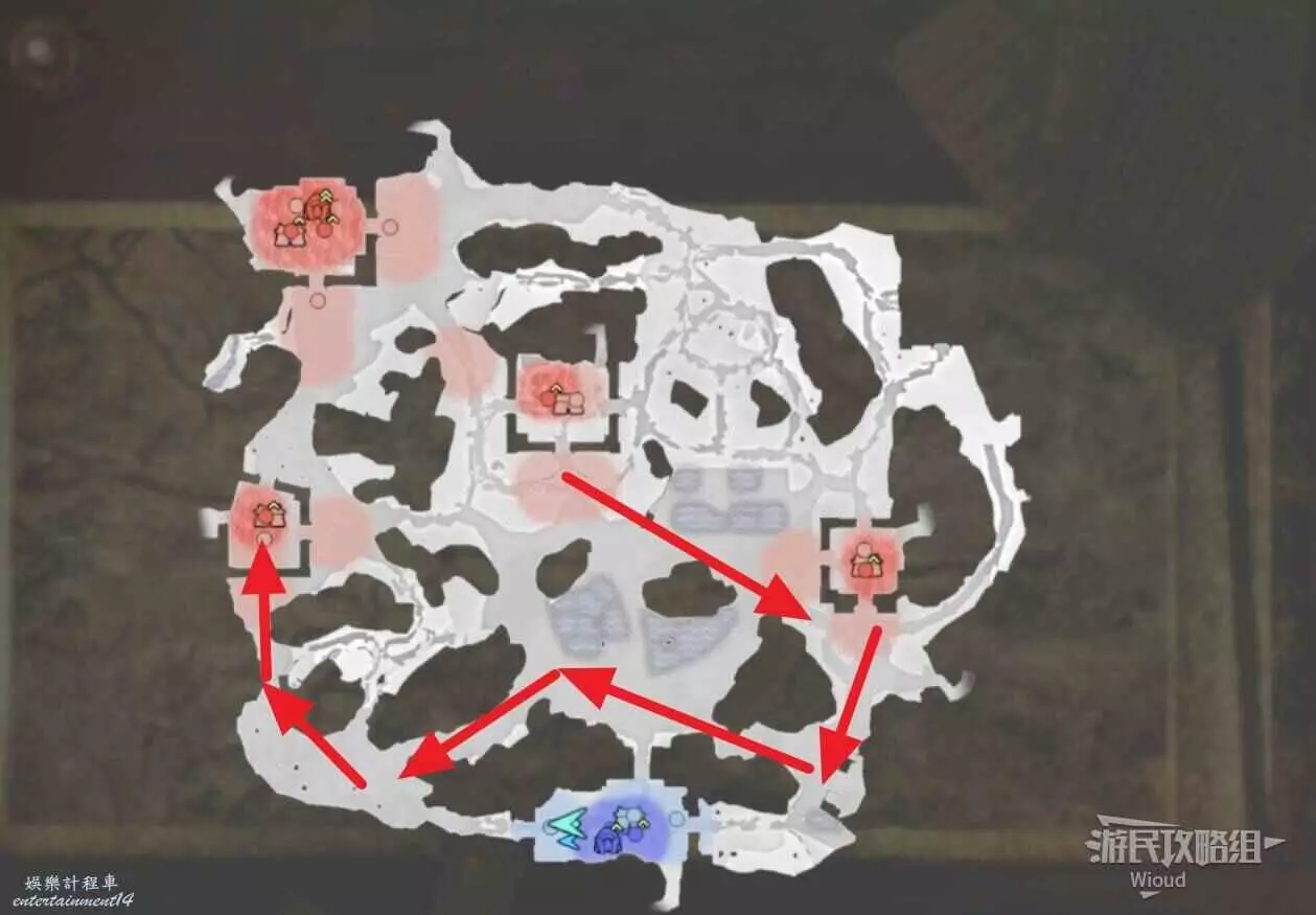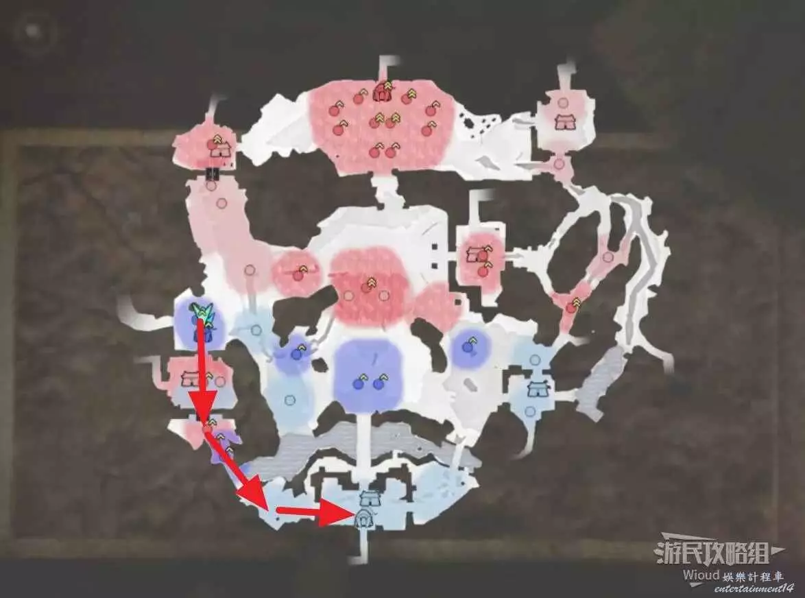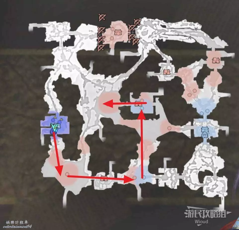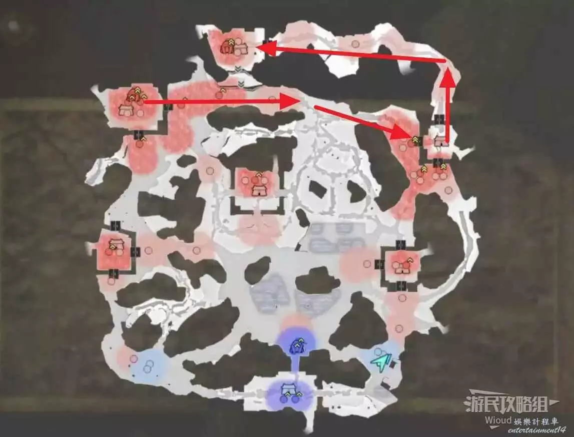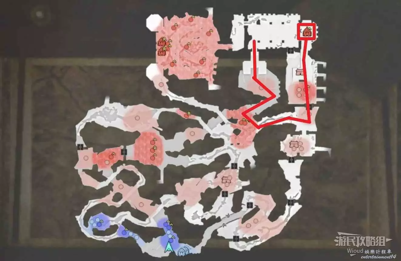 這場戰鬥的起點位於地圖左下角,這裡先往左邊的道路走,中間有一個岔路可以選擇兩條路線,下圖都為大家標註好了,擊敗沿途的所有敵人來到右上角區域。