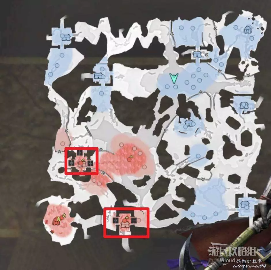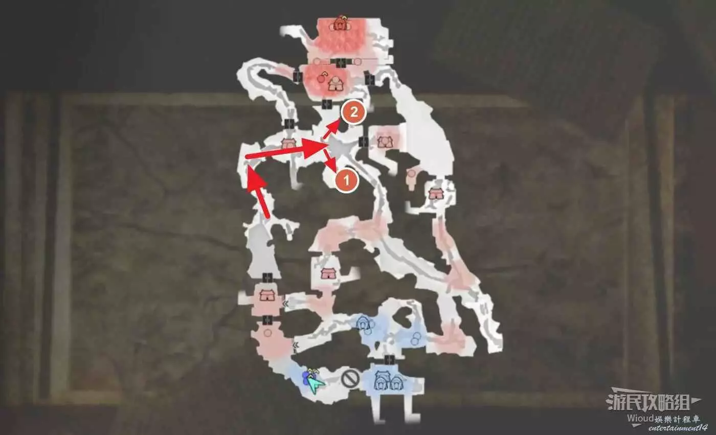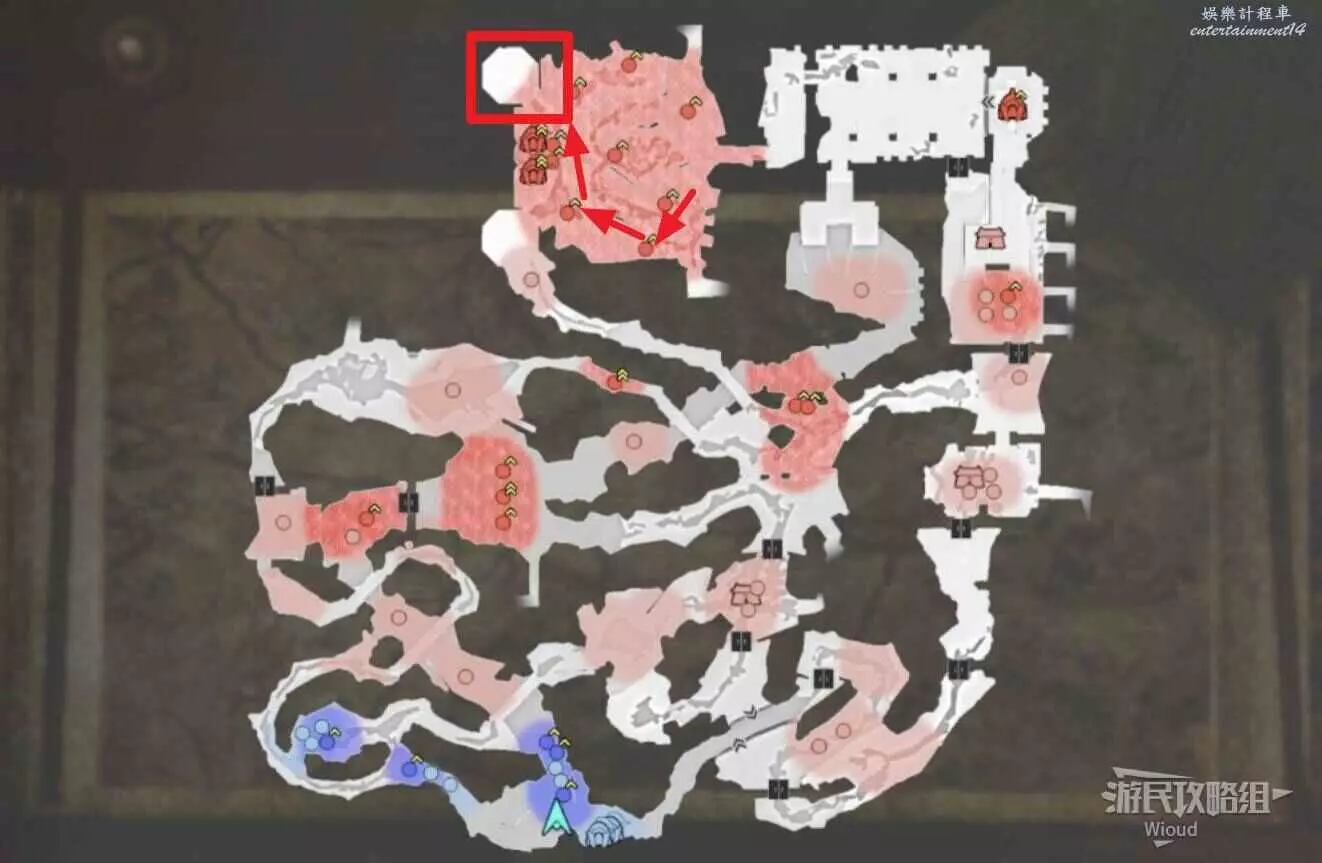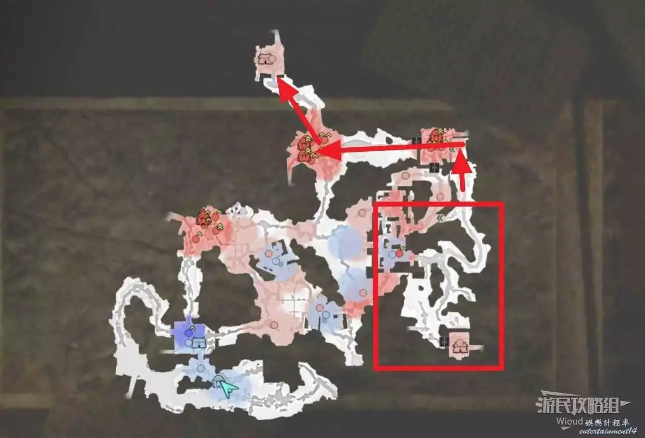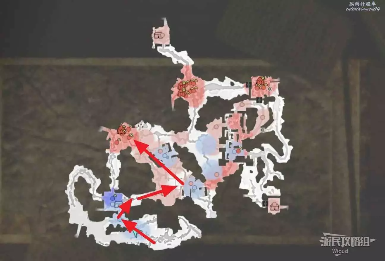 這場戰鬥的起點位於地圖左下角,這裡先往左邊的道路走,中間有一個岔路可以選擇兩條路線,下圖都為大家標註好了,擊敗沿途的所有敵人來到右上角區域。
