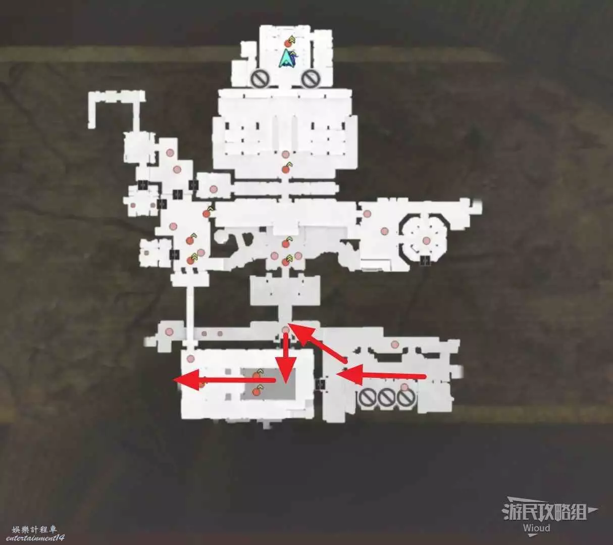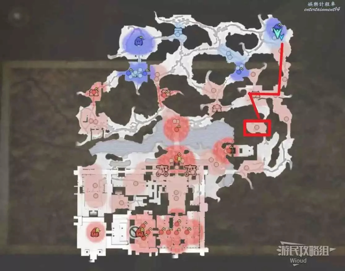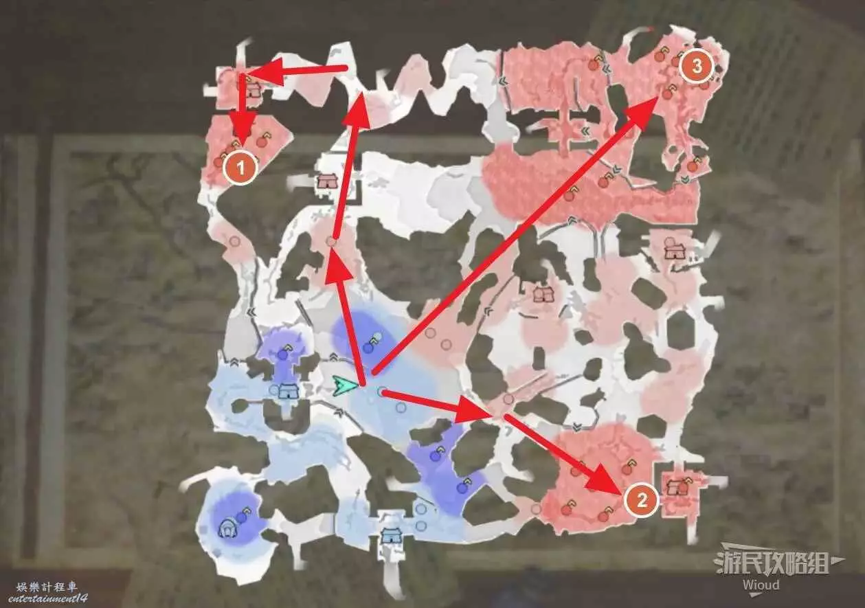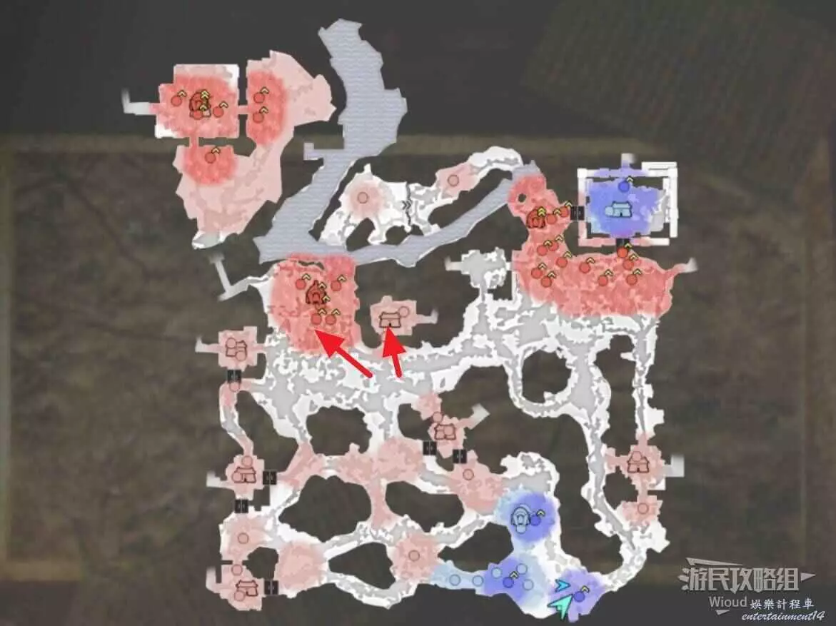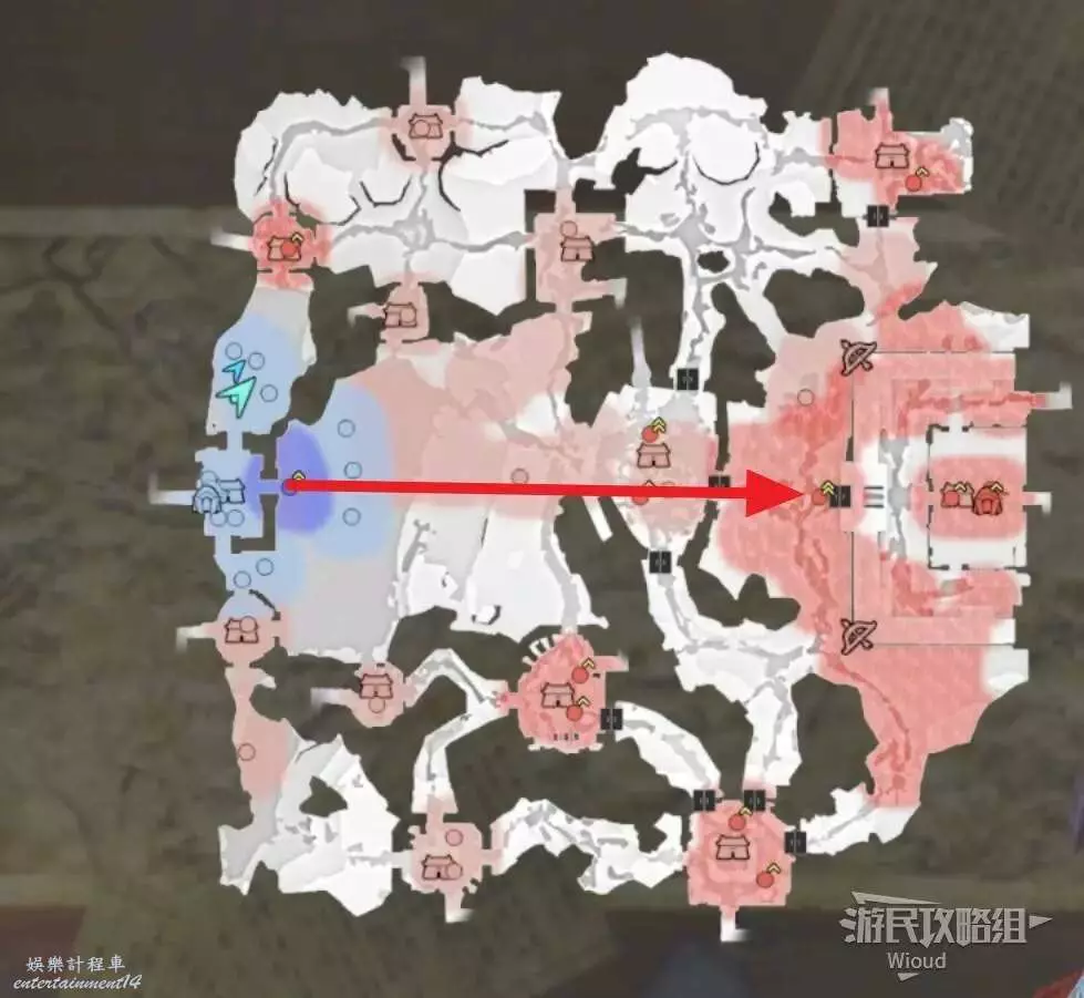 這場戰鬥的起點位於地圖左下角,這裡先往左邊的道路走,中間有一個岔路可以選擇兩條路線,下圖都為大家標註好了,擊敗沿途的所有敵人來到右上角區域。