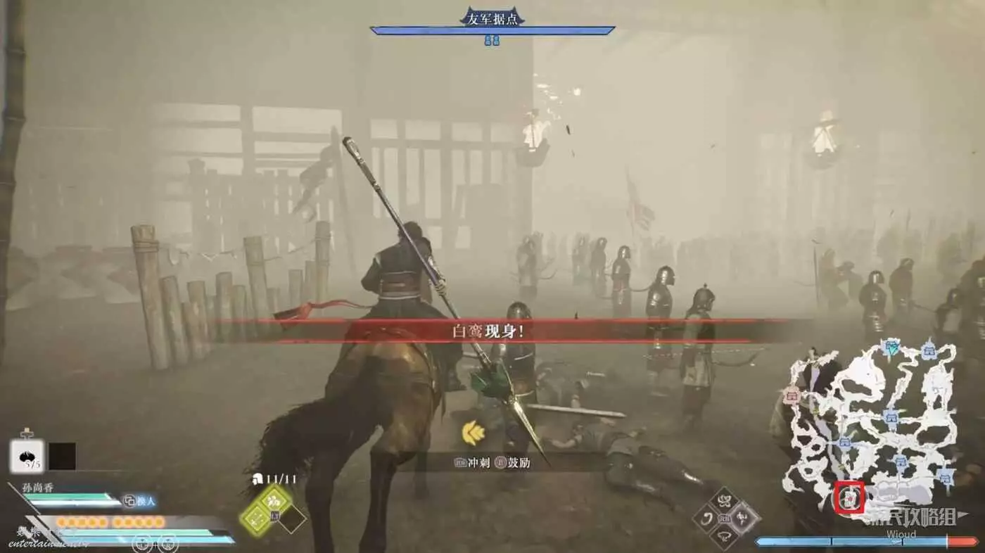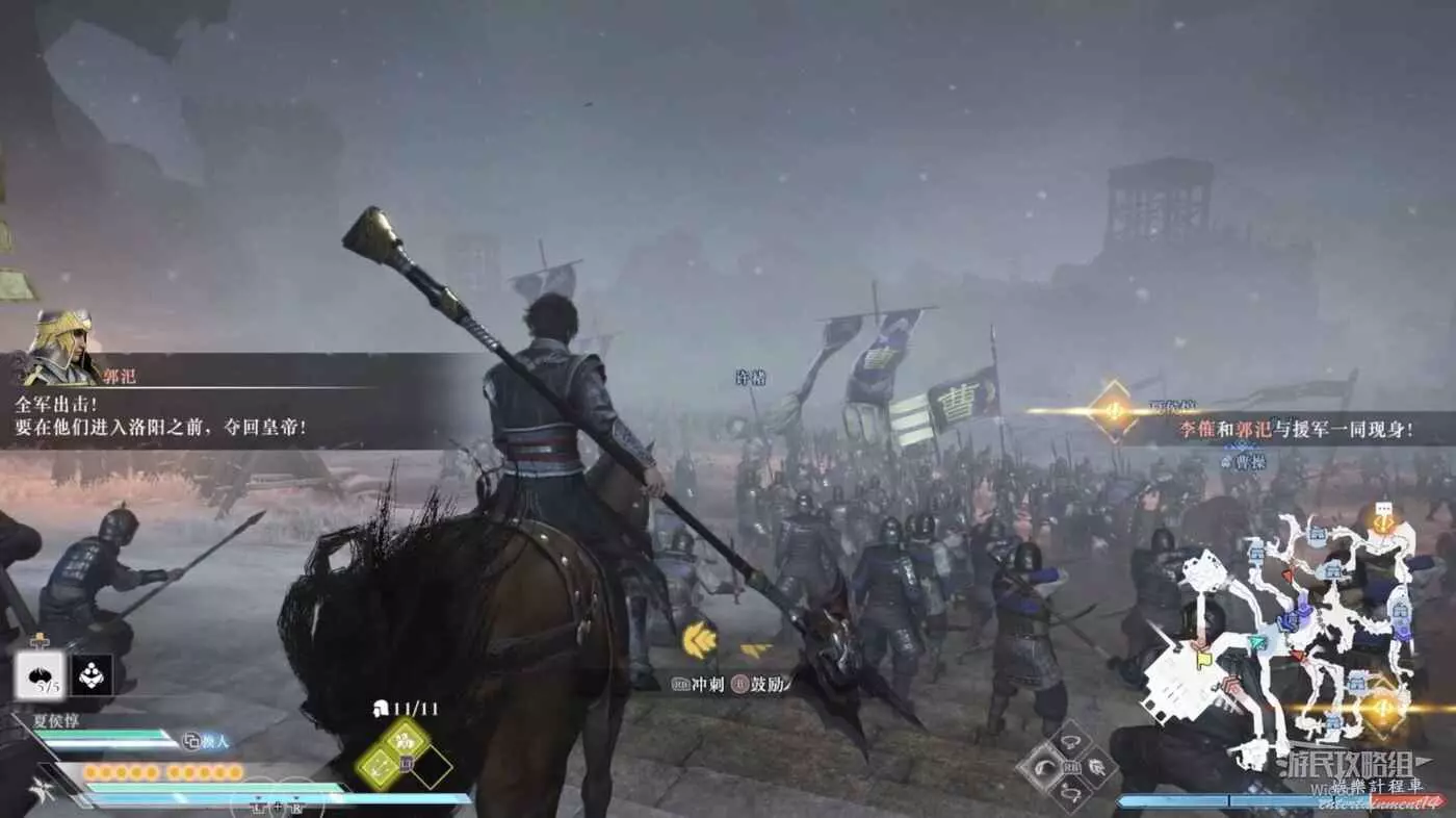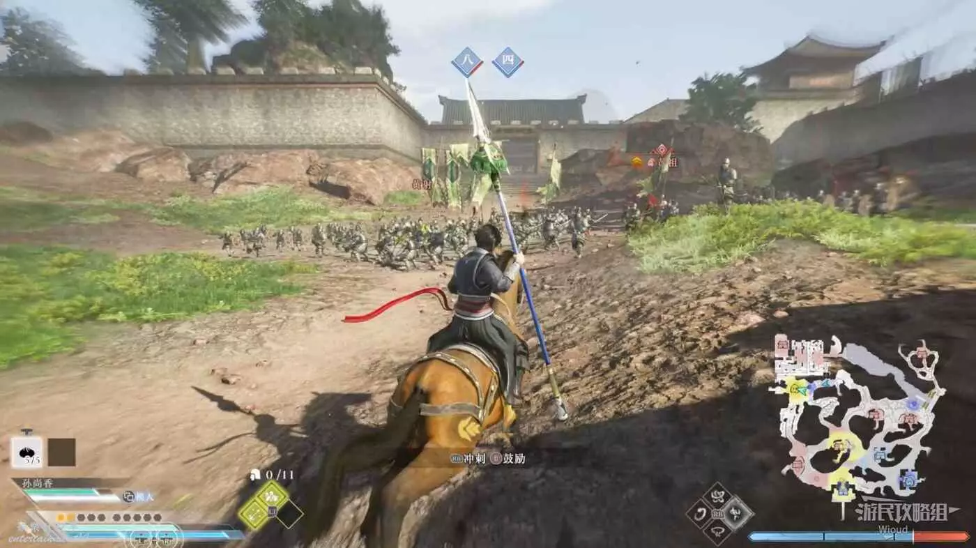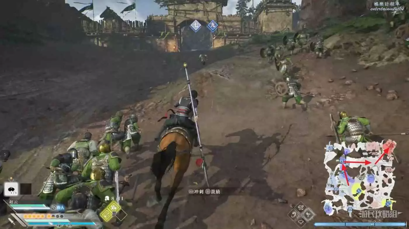 我們按照弱弱強的順序先去打左上角的大軍,無需直接幹掉大軍,擊敗大軍內的軍團長即可,當一個大軍被擊敗,剩餘兵力會往其他大軍的位置跑,這裡一定要騎馬攔截。