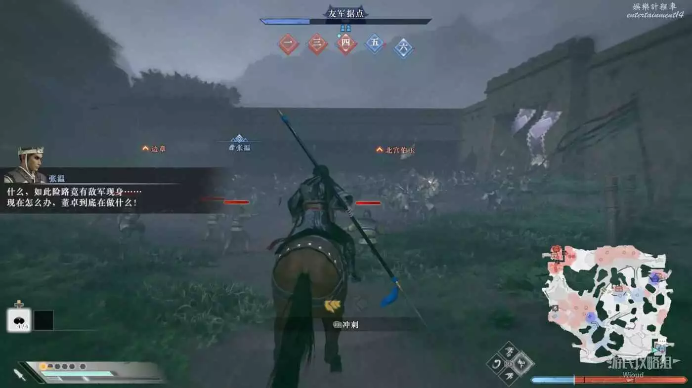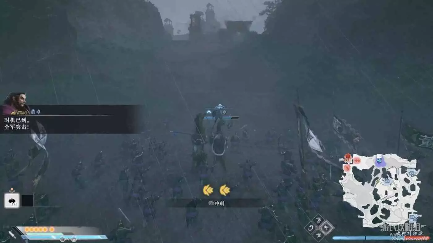回到地圖中間,清繳兩側的據點後,董卓會在中間等到玩家,進入白圈直接往張角大軍衝鋒。
