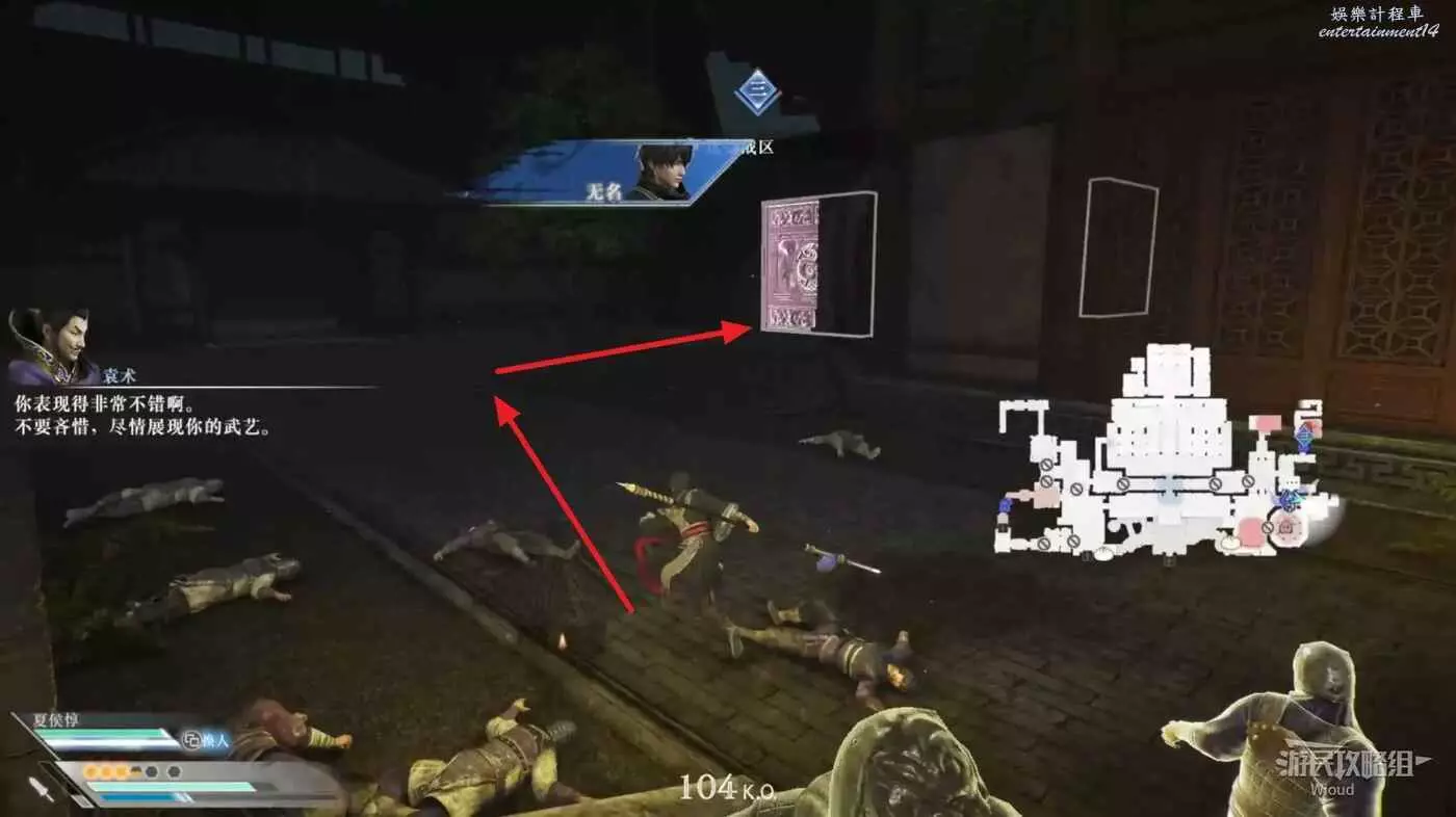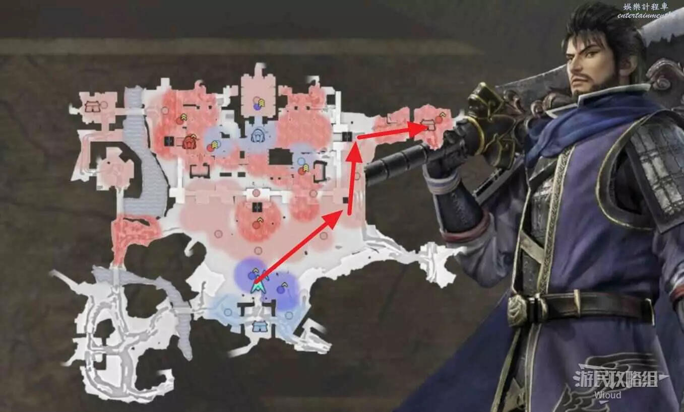 完成小沛逃亡戰後自動開啟【下邳之戰】,這場戰鬥的關鍵因素就是位於地圖右側的水閘,開局直接沿著下圖紅線移動到水閘的位置,擊敗這裡的敵人。