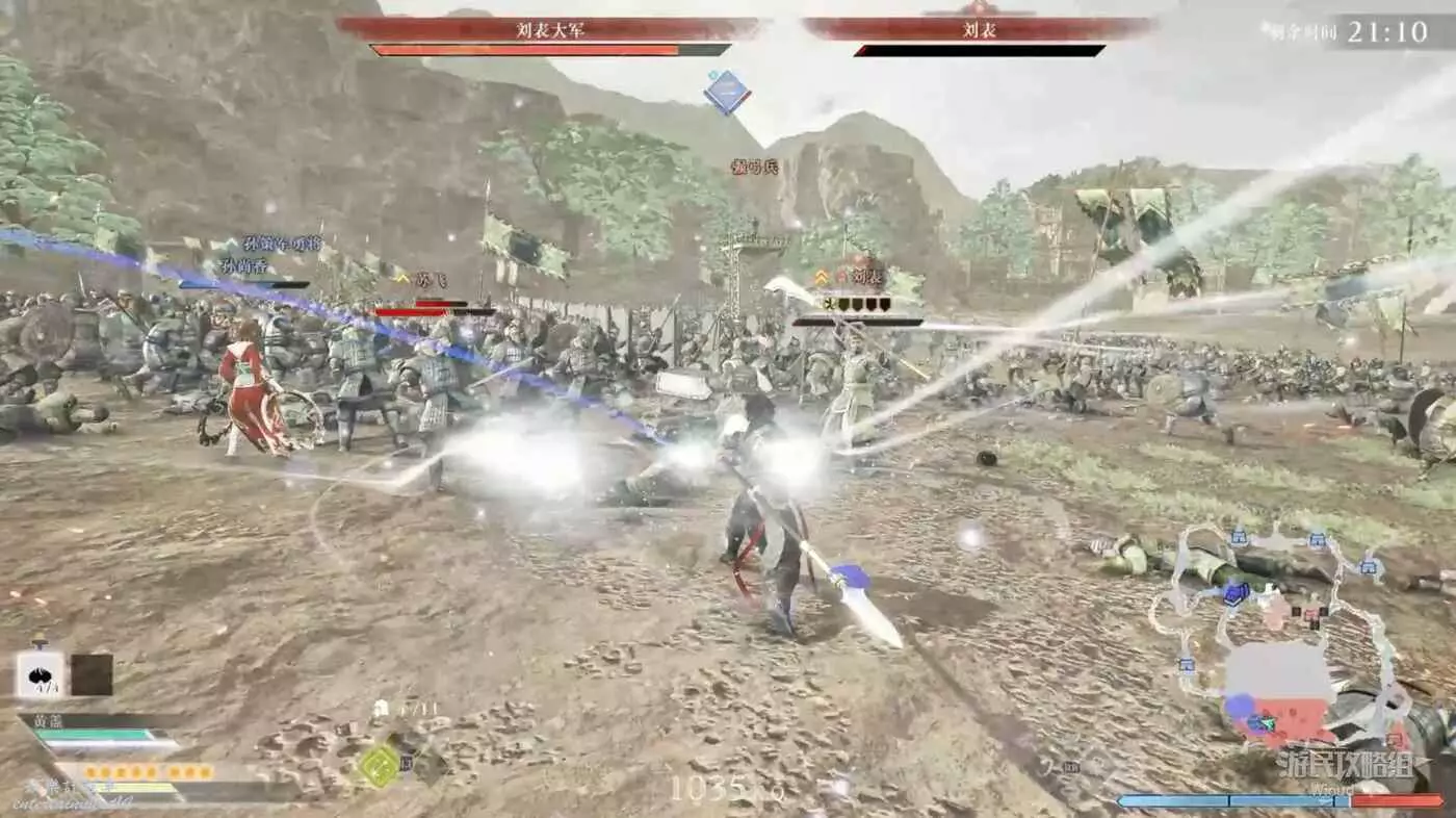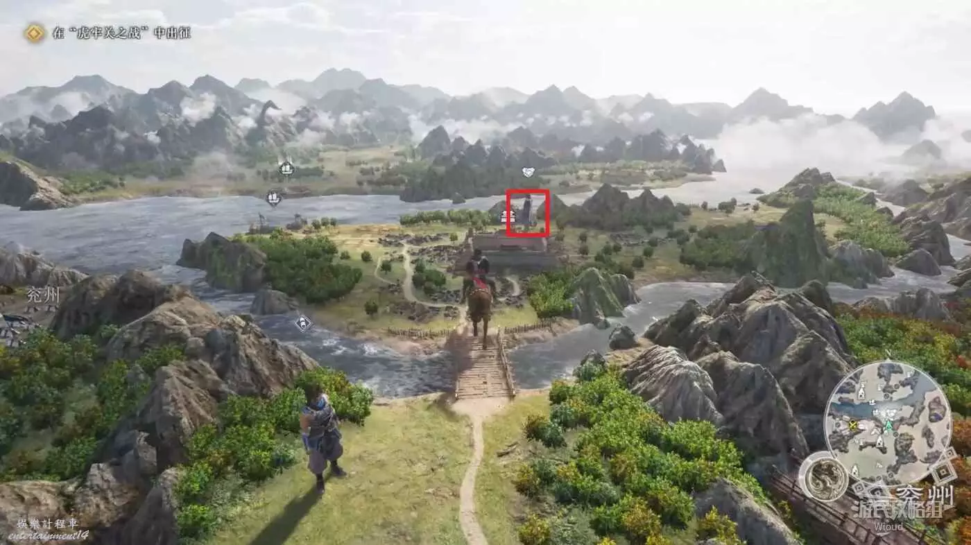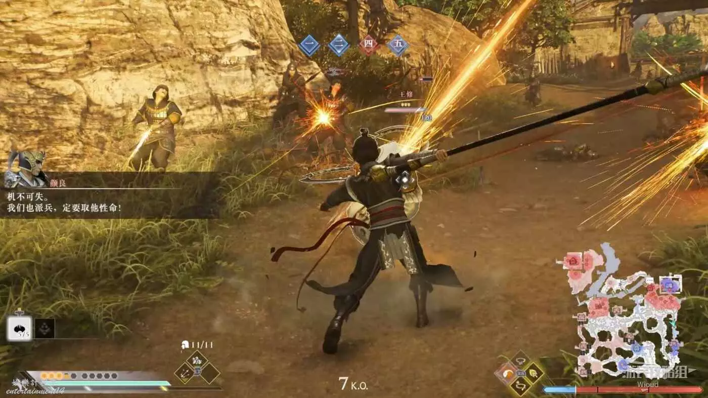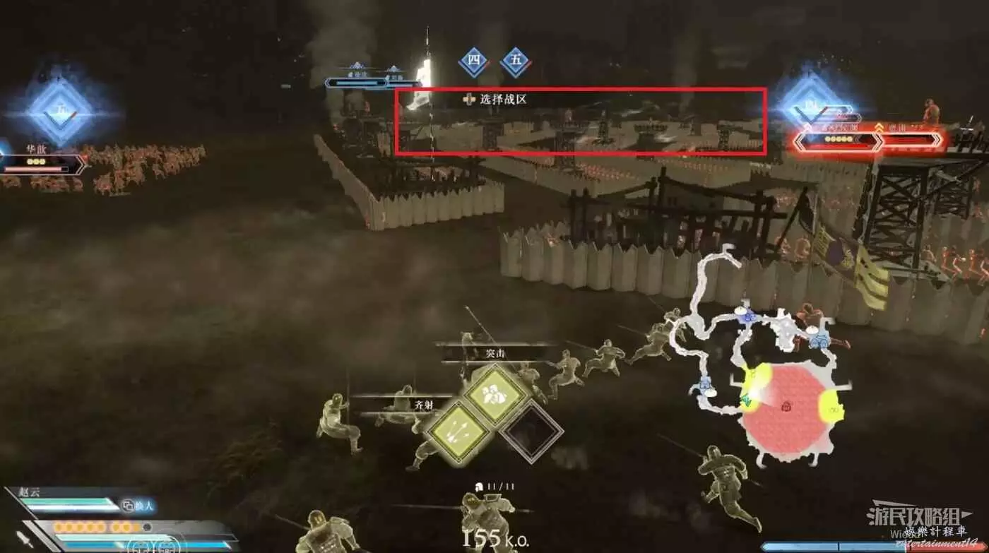 需要注意的是,地圖中間正上方的橫向長道兩邊高台都有提前埋伏好的弓箭手,我們要比關張更快走到這,提前繞上去擊敗兩邊的弓箭手,然後在這個峽谷中間迎戰後面追來的張遼等人。