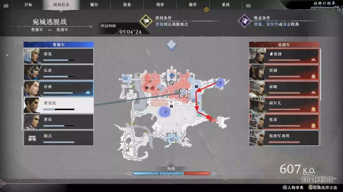 曹操線的小沛逃亡戰與劉備線的路程有些許不同,開局按照下圖路線往下面繞到中間,將劉備解救下來。