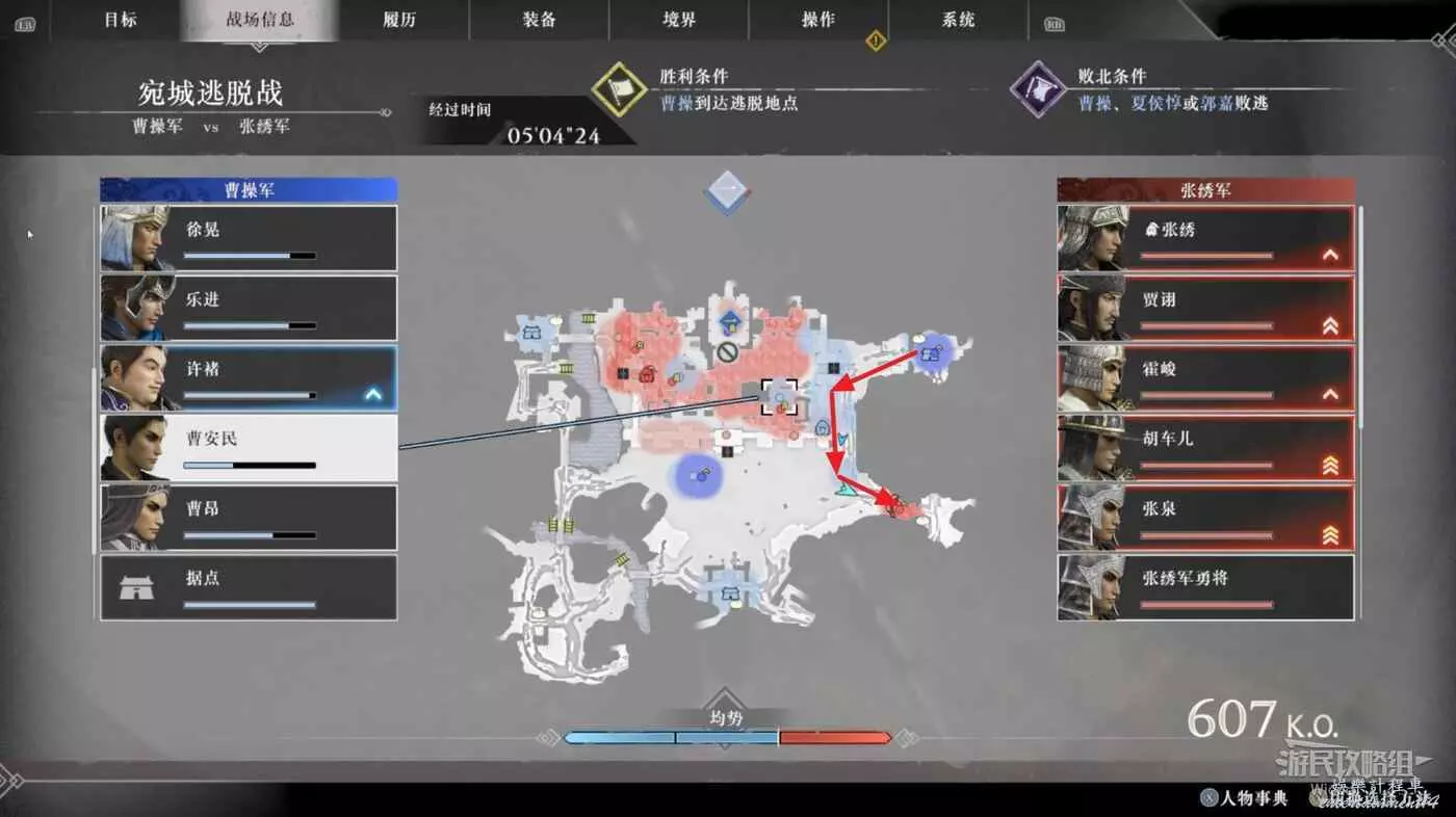 曹操線的小沛逃亡戰與劉備線的路程有些許不同,開局按照下圖路線往下面繞到中間,將劉備解救下來。