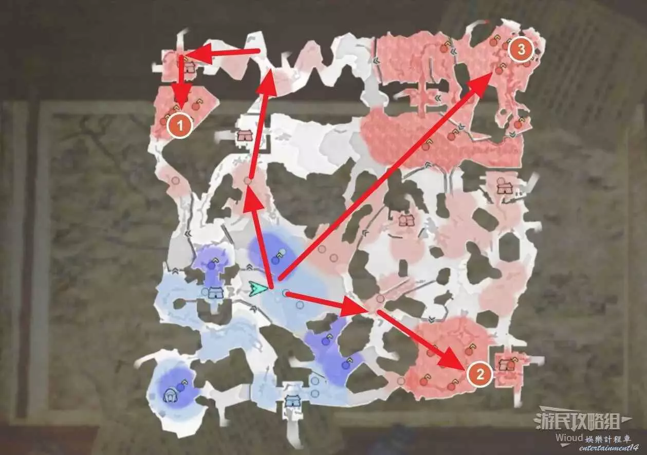 開局先在中間戰場擊敗張郃大局穩住局勢,然後從左側或右側按照下圖路線示意,將兩側的據點拿下。