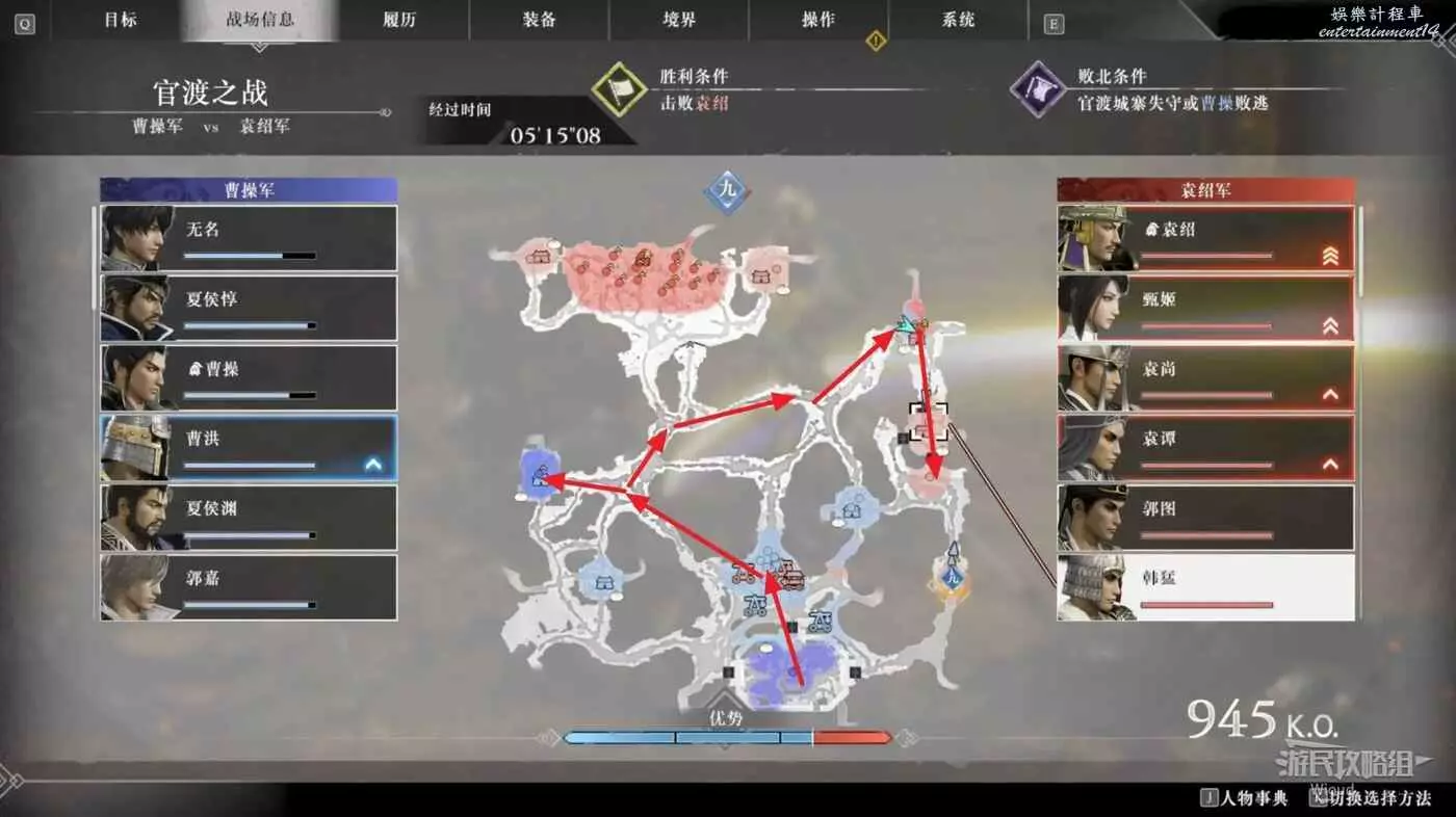 這次戰鬥沒什麼要點,前面需要幫著曹操拔除大部分敵對據點,然後擊敗右上角的袁尚大軍。