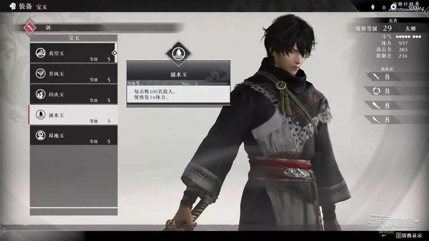 戰前準備頁面,玩家在試玩DEMO可以選擇五種寶玉的其中之一,裝備的寶玉將為玩家提供其介紹的增益屬性。