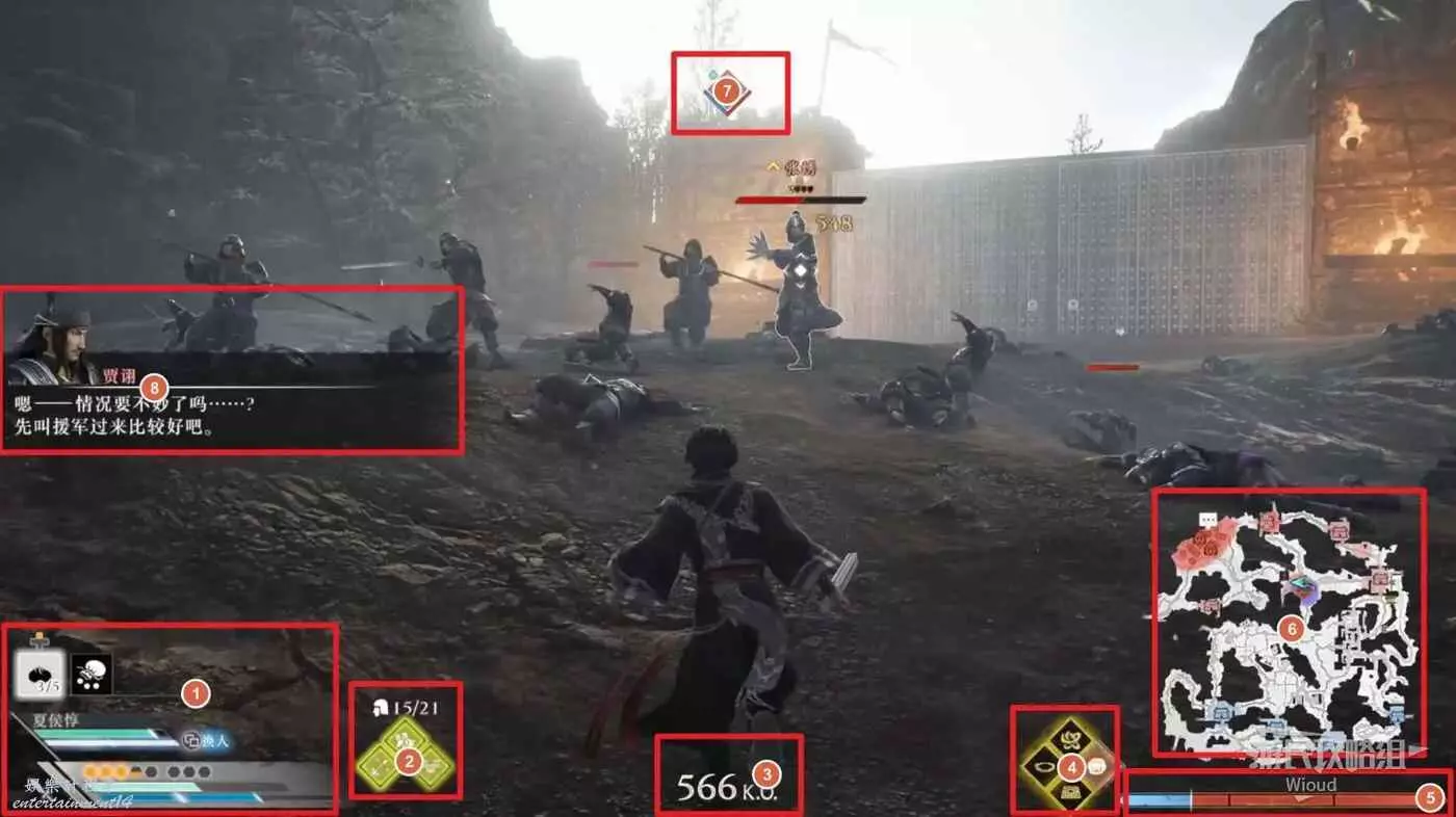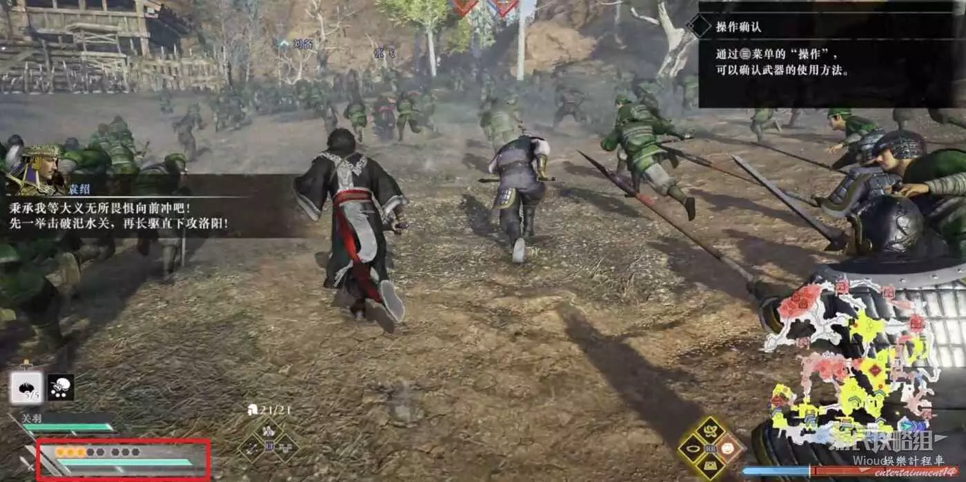 1、左下角是玩家操控角色的血量(青綠)、鬥氣(黃)、無雙量表(深藍),玩家血條上方可以查看同行武將的血條以及無雙量表。